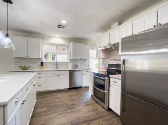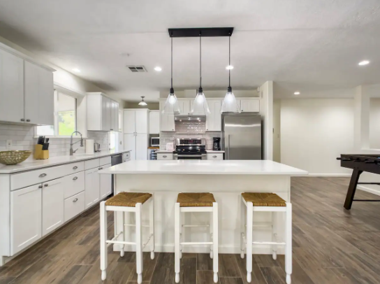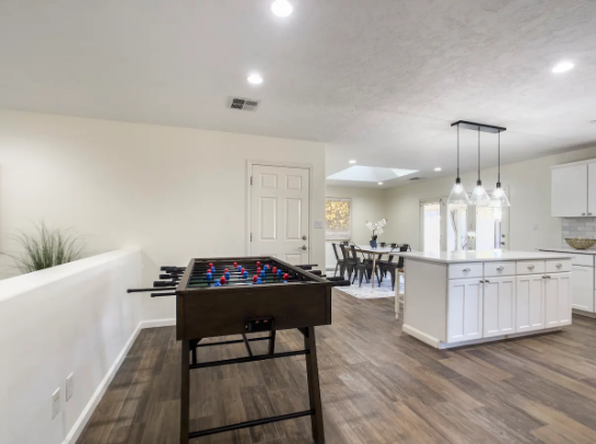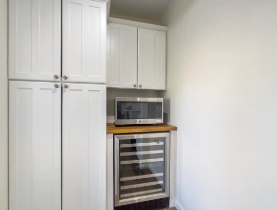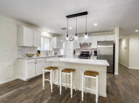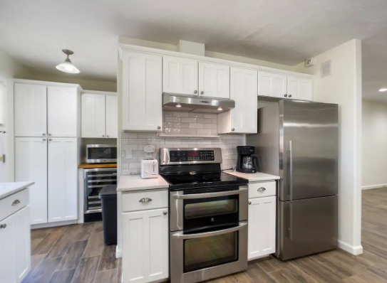 The huge kitchen is a dream for any culinary enthusiast, complete with a dishwasher, wine cooler, coffee maker, and a convenient island where guests can hang out and socialize. The dining table comfortably seats 8, allowing for enjoyable group meals and gatherings.