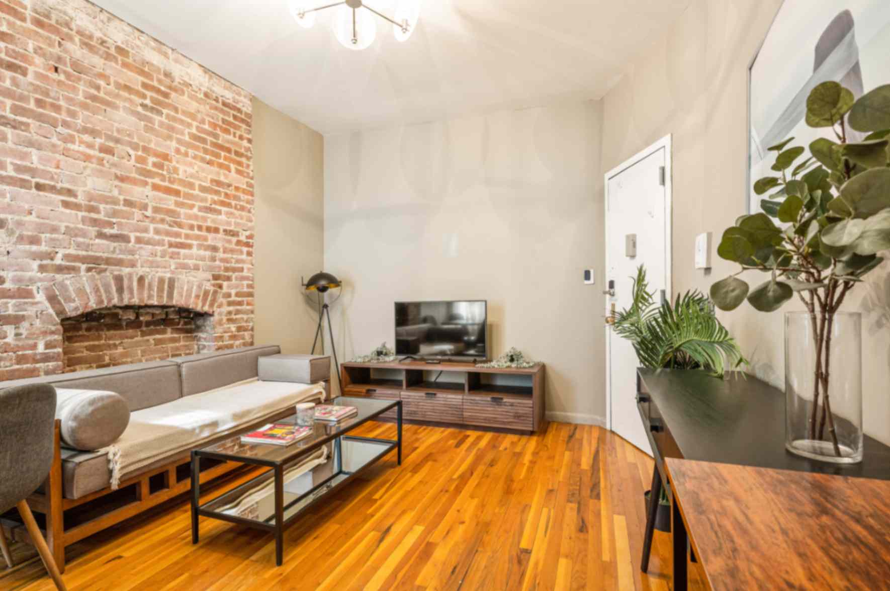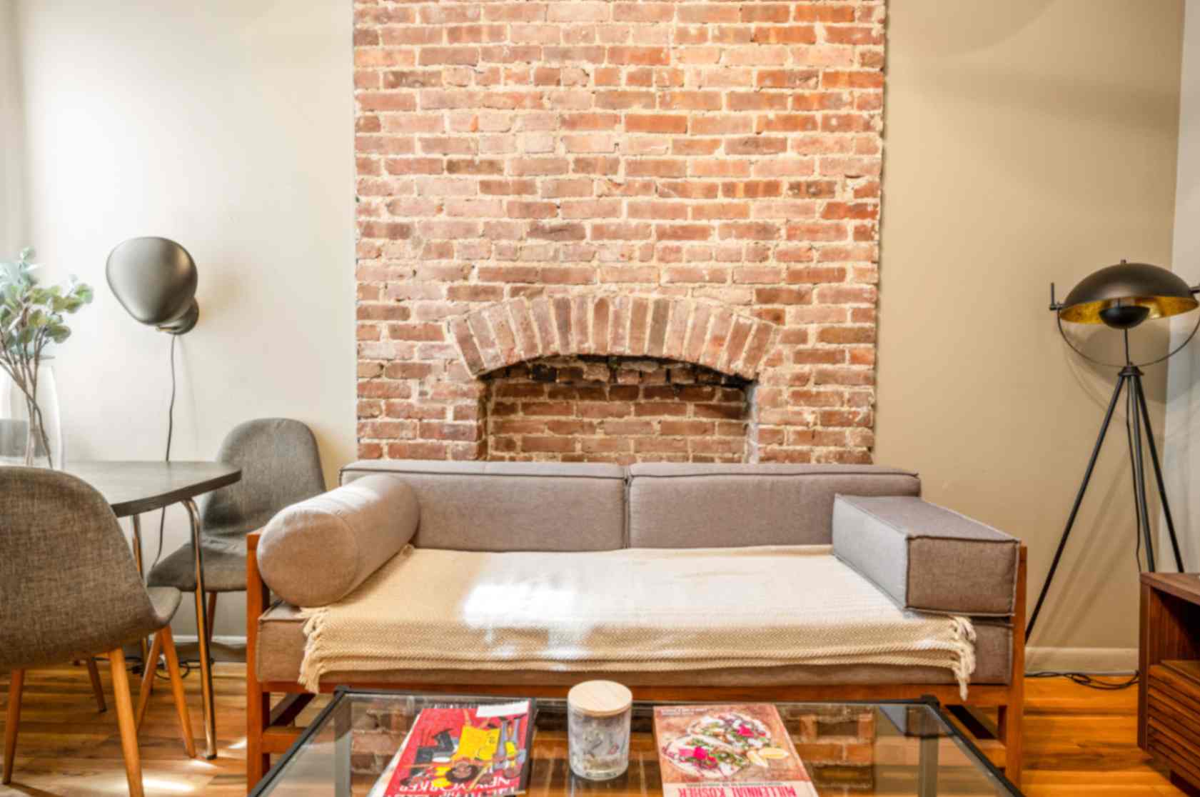 Welcome to our charming 1BR apartment, located in the vibrant Upper West Side of New York. The beautiful living room is designed for relaxation and comfort, featuring exposed brick walls that add a touch of character and warmth to the space.