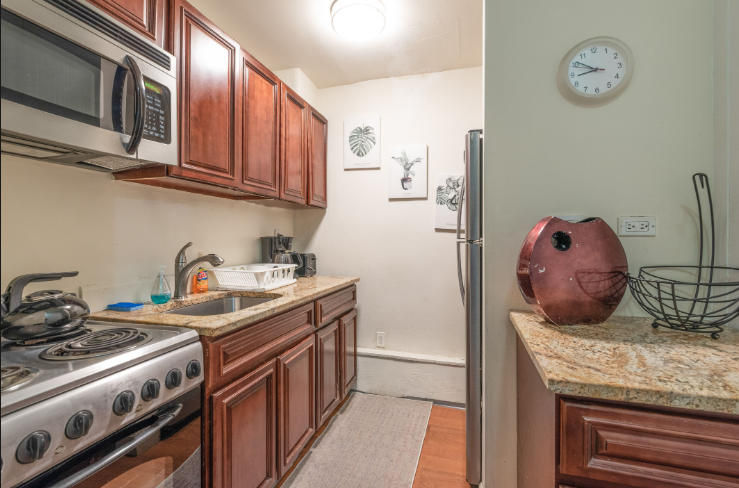 A traditional kitchen fully equipped with a refrigerator, microwave, and stove, perfect for all your cooking needs.