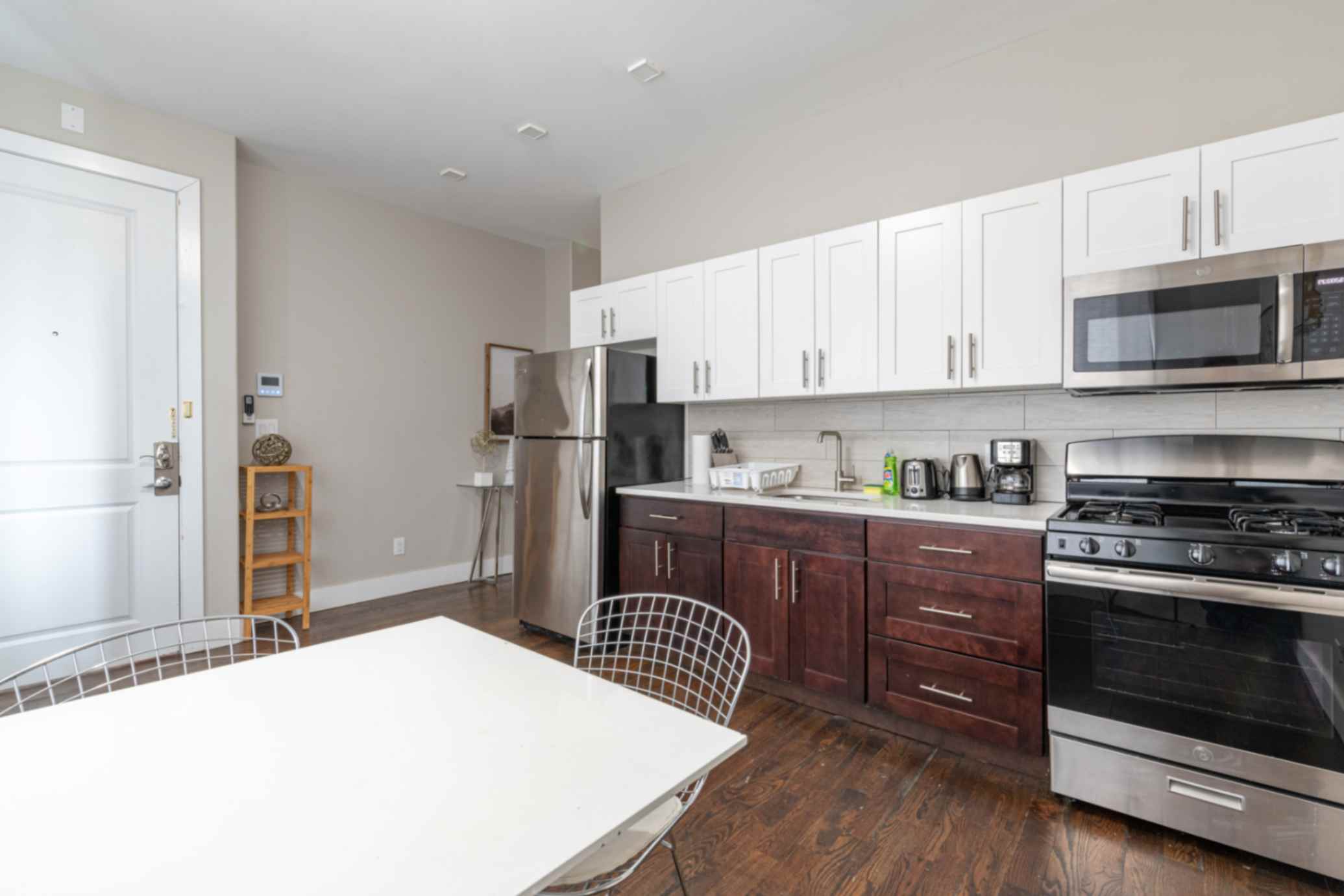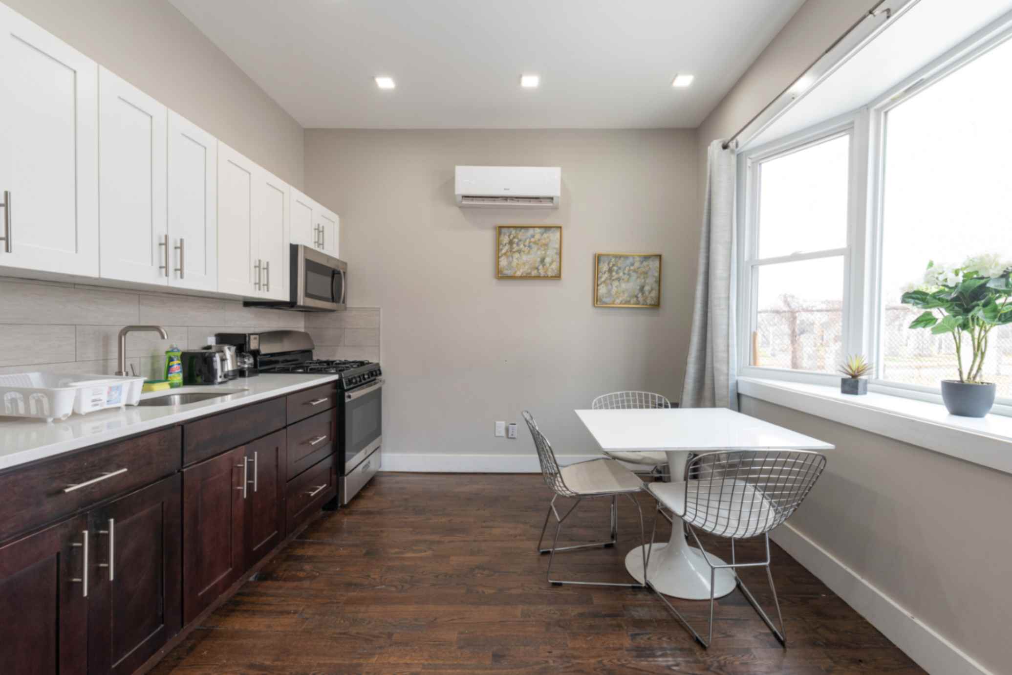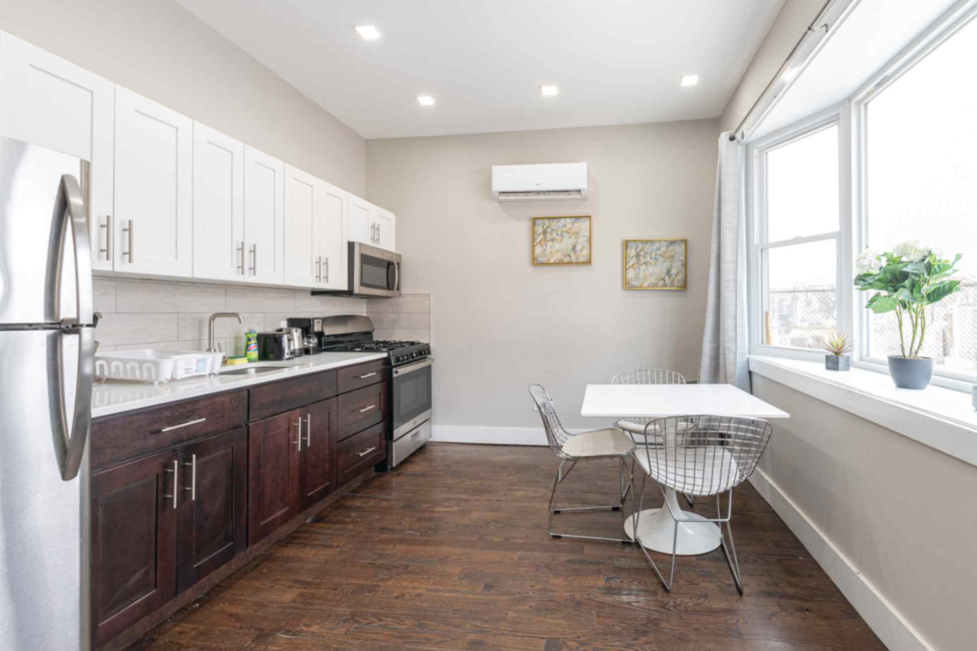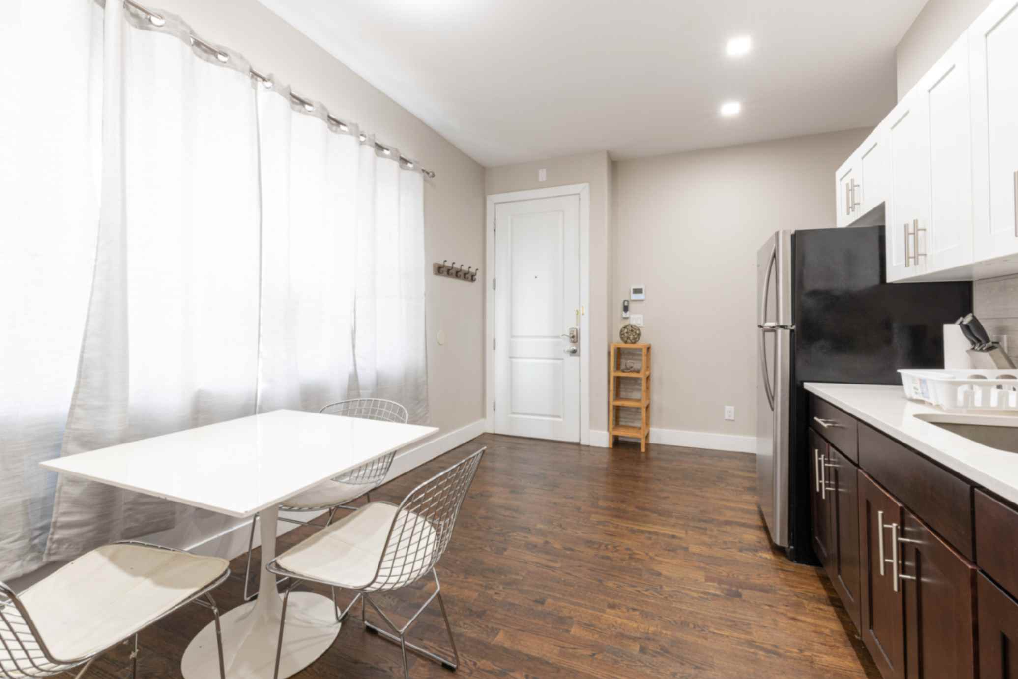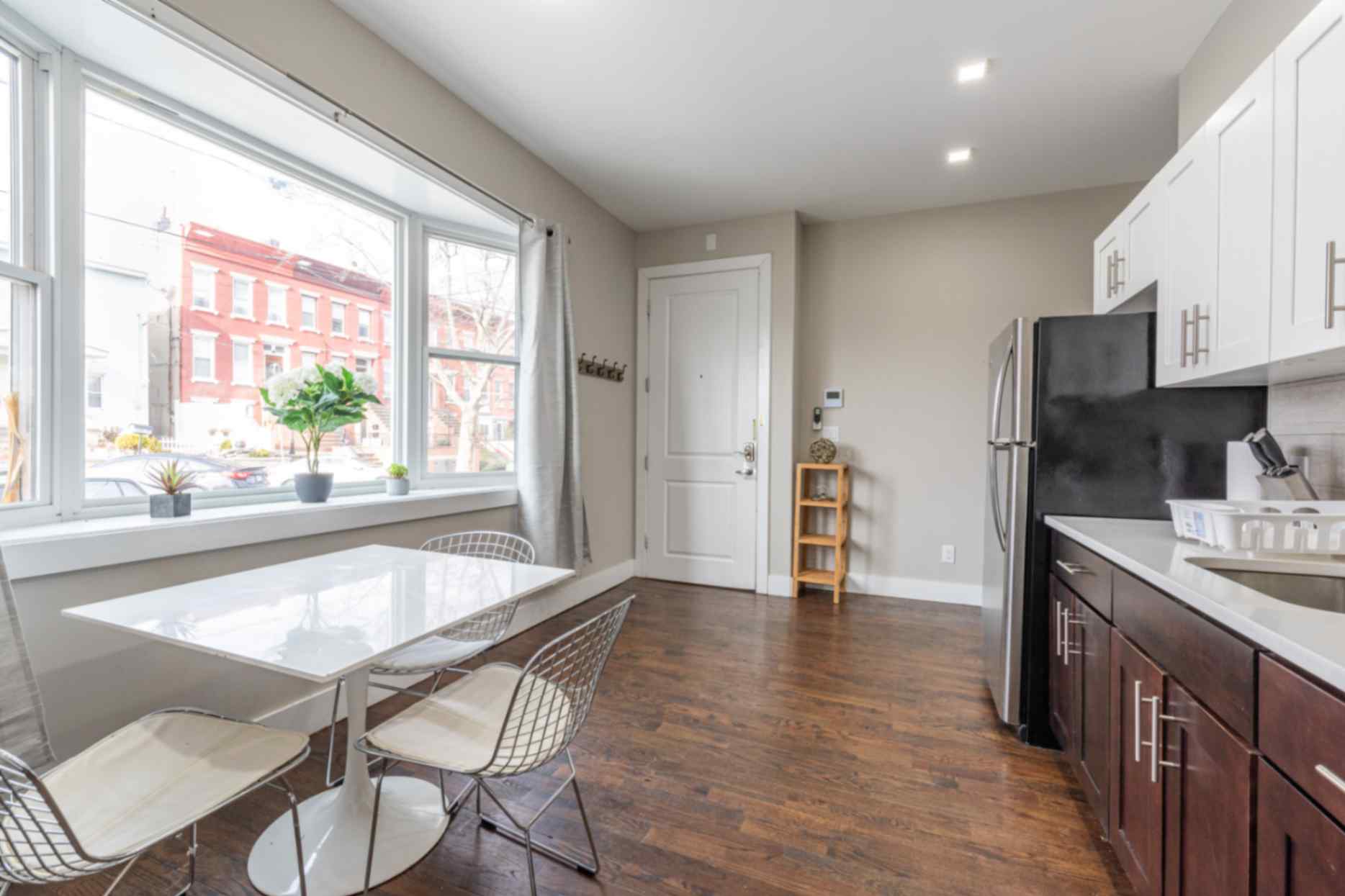 Welcome to this exquisitely renovated ground-floor 2-bedroom apartment, nestled on a tranquil block mere steps away from the Journal Square Path Train. Revel in the comfort of two queen bedrooms, complemented by high-speed WiFi and complimentary Netflix for your entertainment. The inviting dining space seamlessly merges with a fully equipped kitchen, boasting all the essential tools needed for delightful home-cooked meals. Situated on a peaceful dead-end street, you can relish a noise-free environment without any concerns about disruptive neighbors.