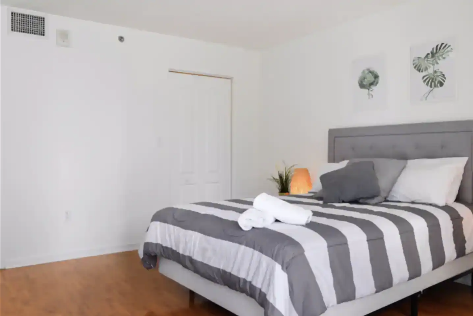 The spacious bedroom features a luxurious queen-size bed and a cozy futon, providing a restful retreat after a day of exploring Miami.