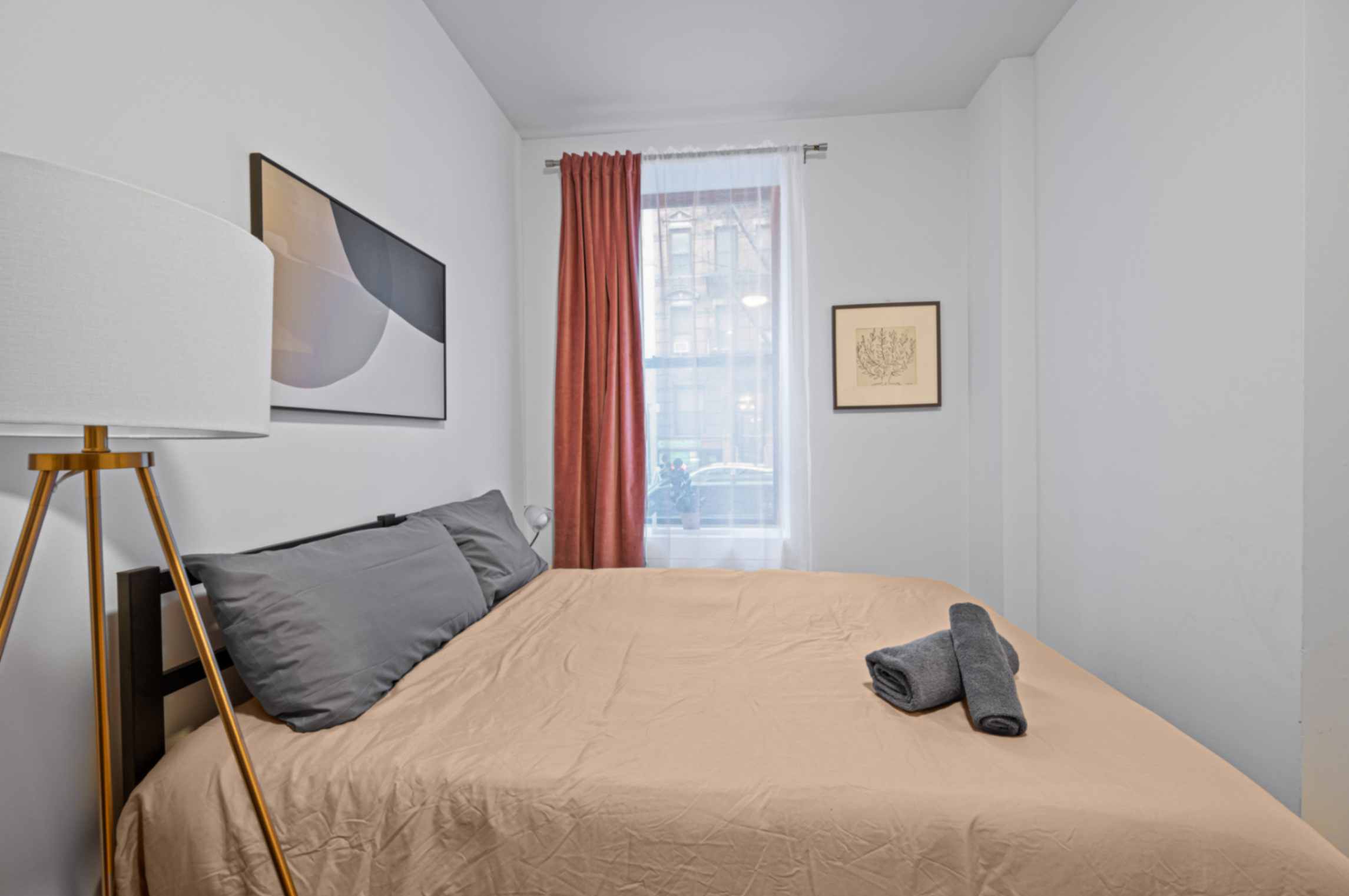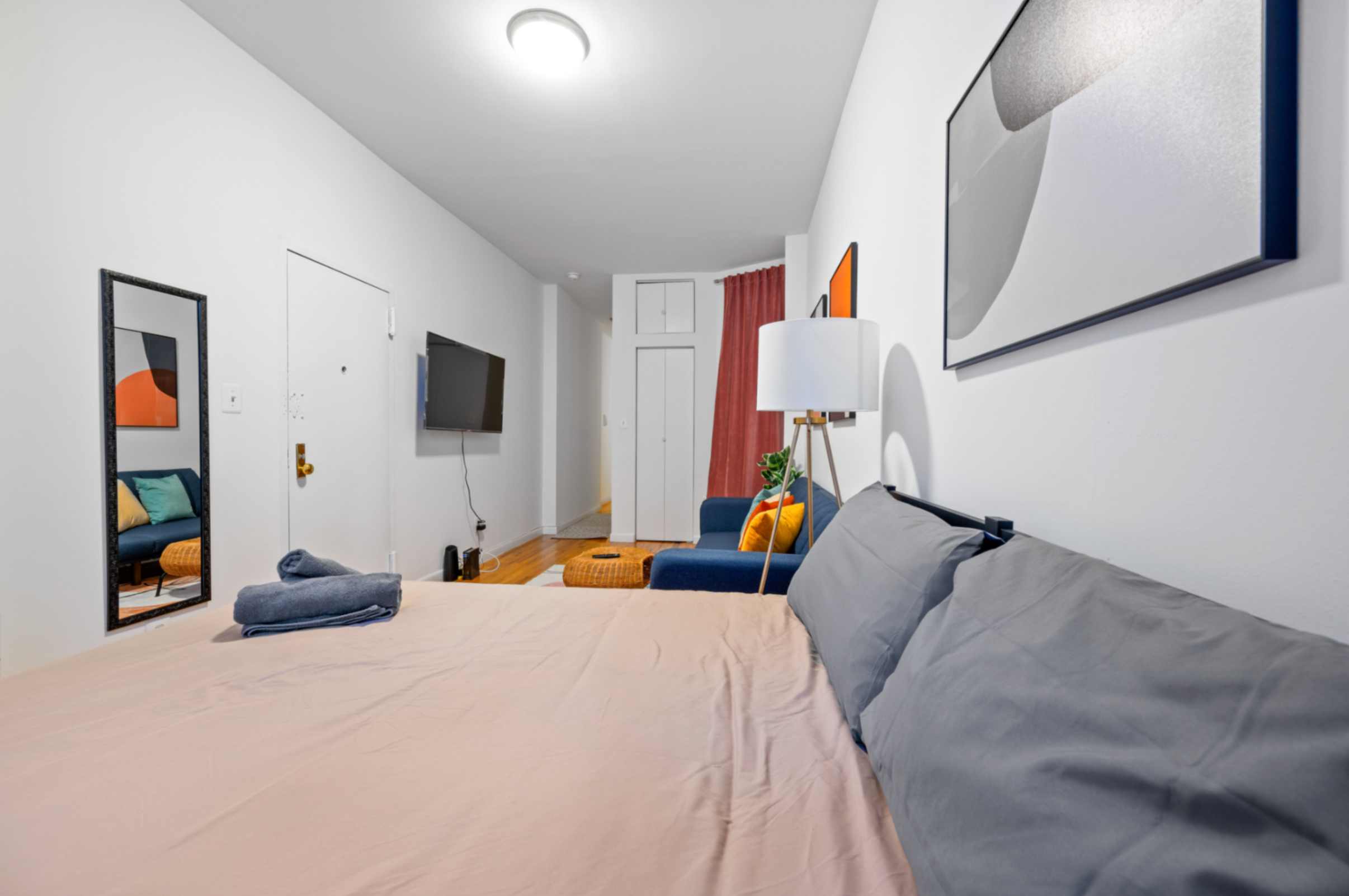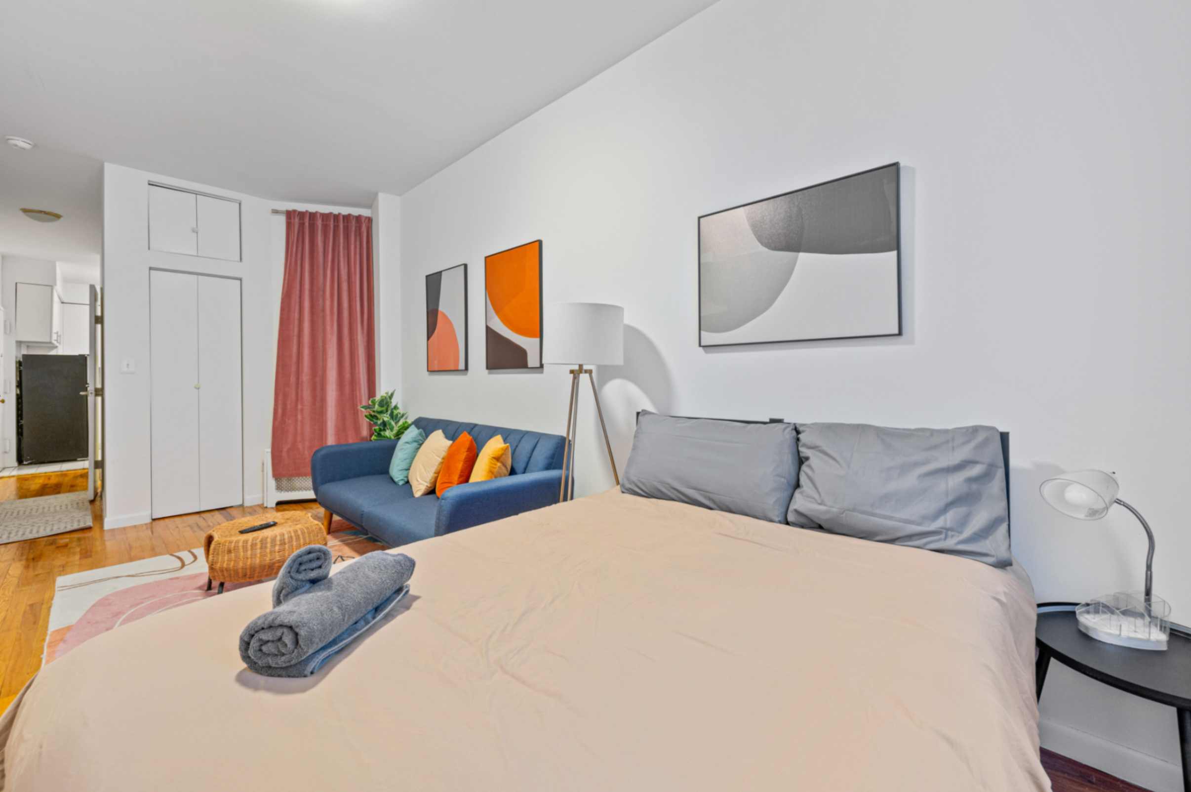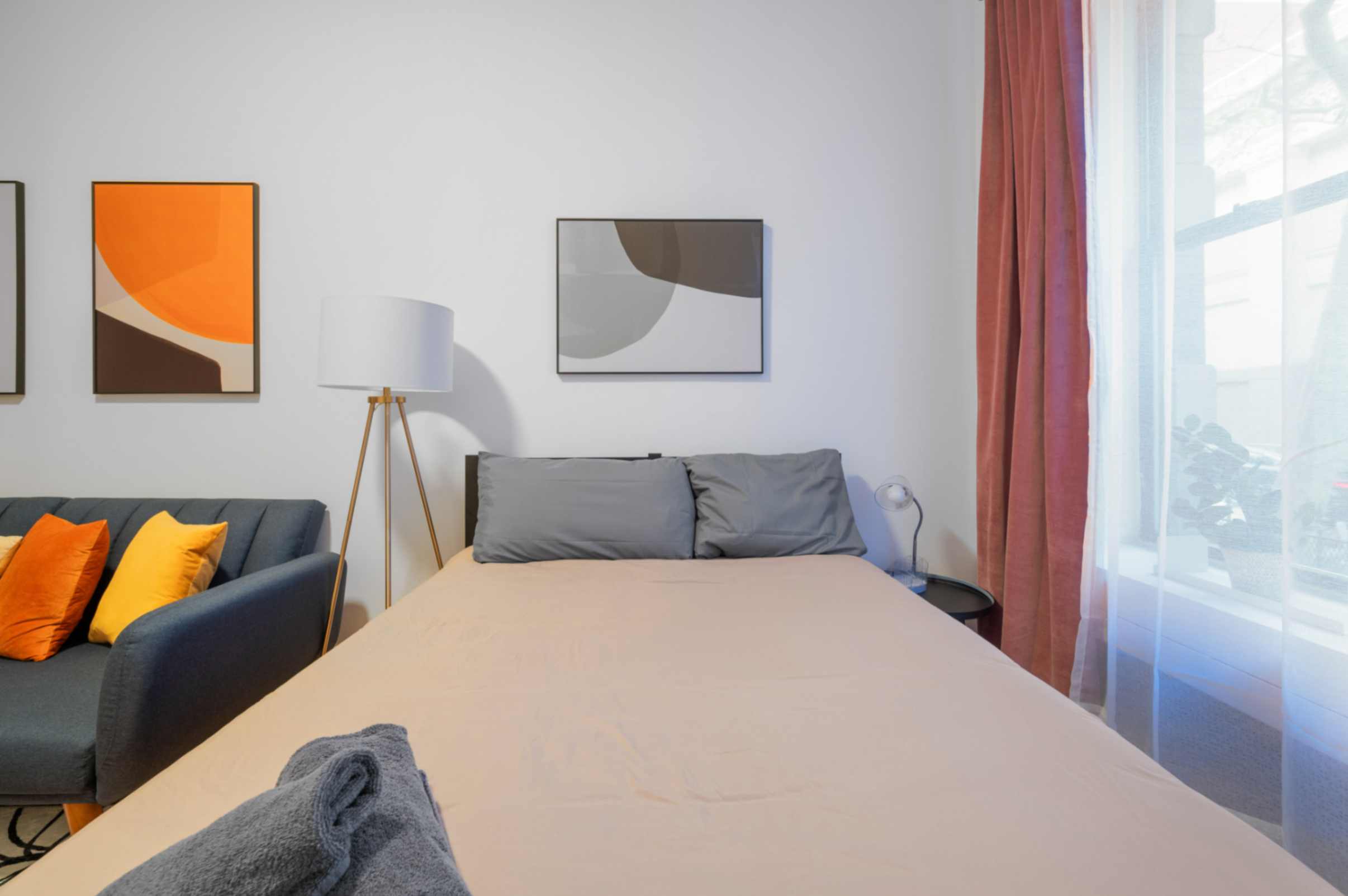 BEDROOMS This charming studio comfortably accommodates 2 guests with a plush queen-size bed. The large windows let in plenty of natural light, creating a bright and airy atmosphere. Enjoy restful nights and wake up refreshed to explore the city.