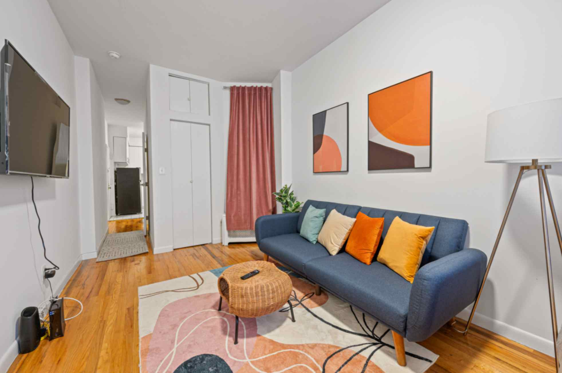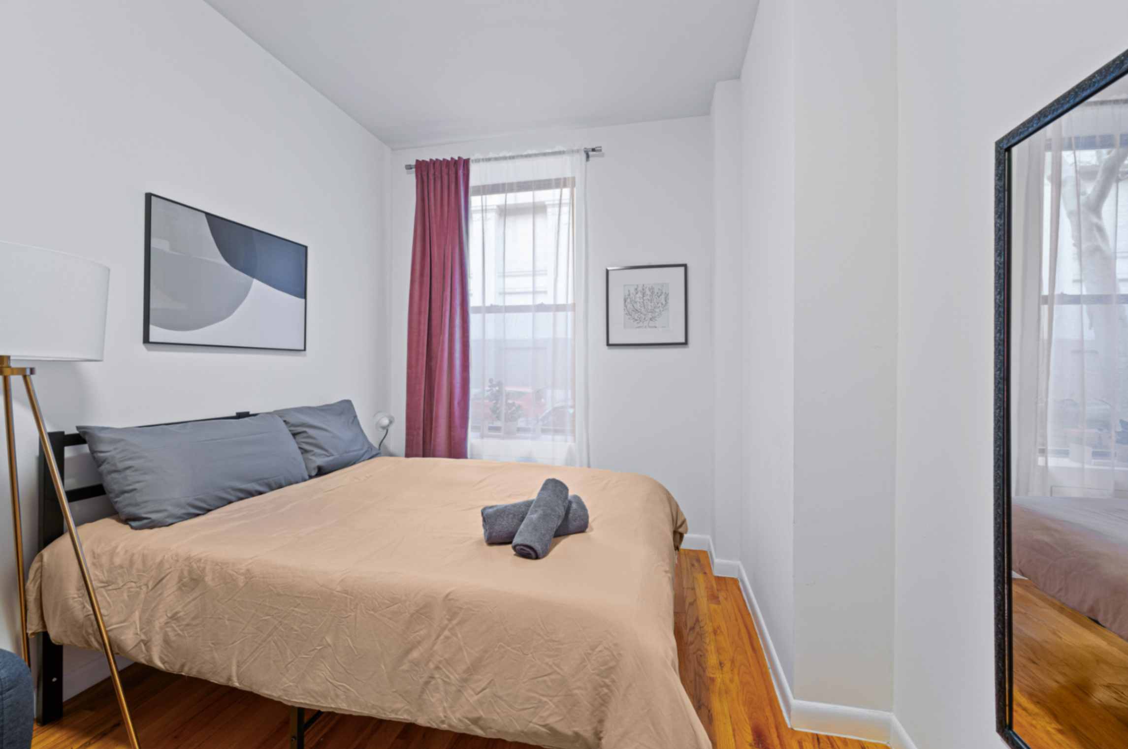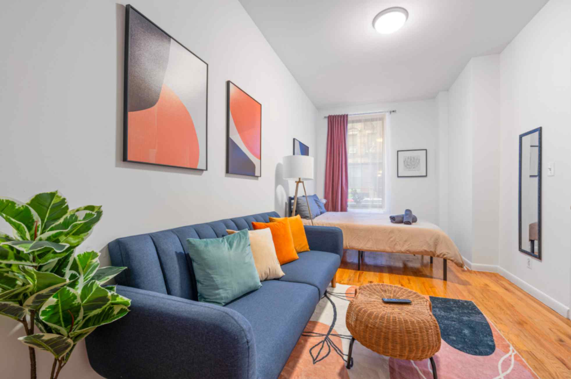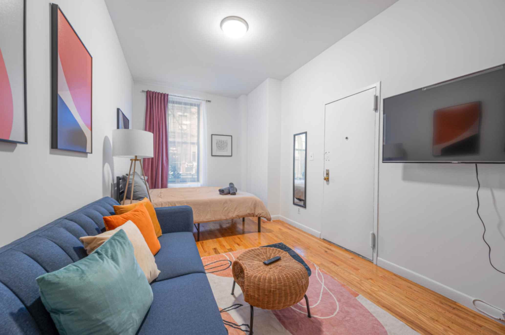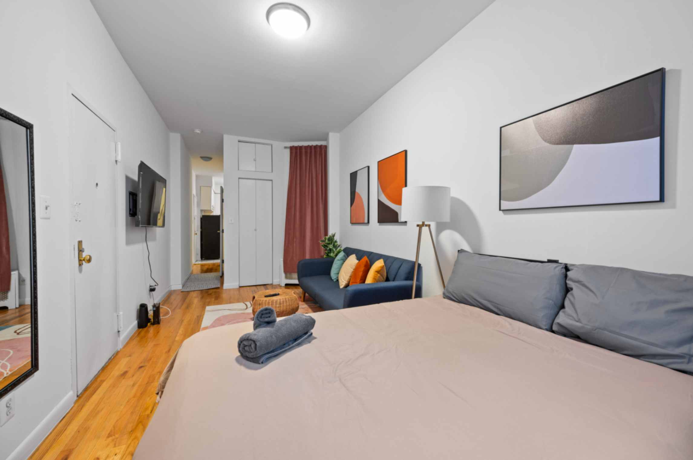 BEDROOMS This charming studio comfortably accommodates 2 guests with a plush queen-size bed. The large windows let in plenty of natural light, creating a bright and airy atmosphere. Enjoy restful nights and wake up refreshed to explore the city.