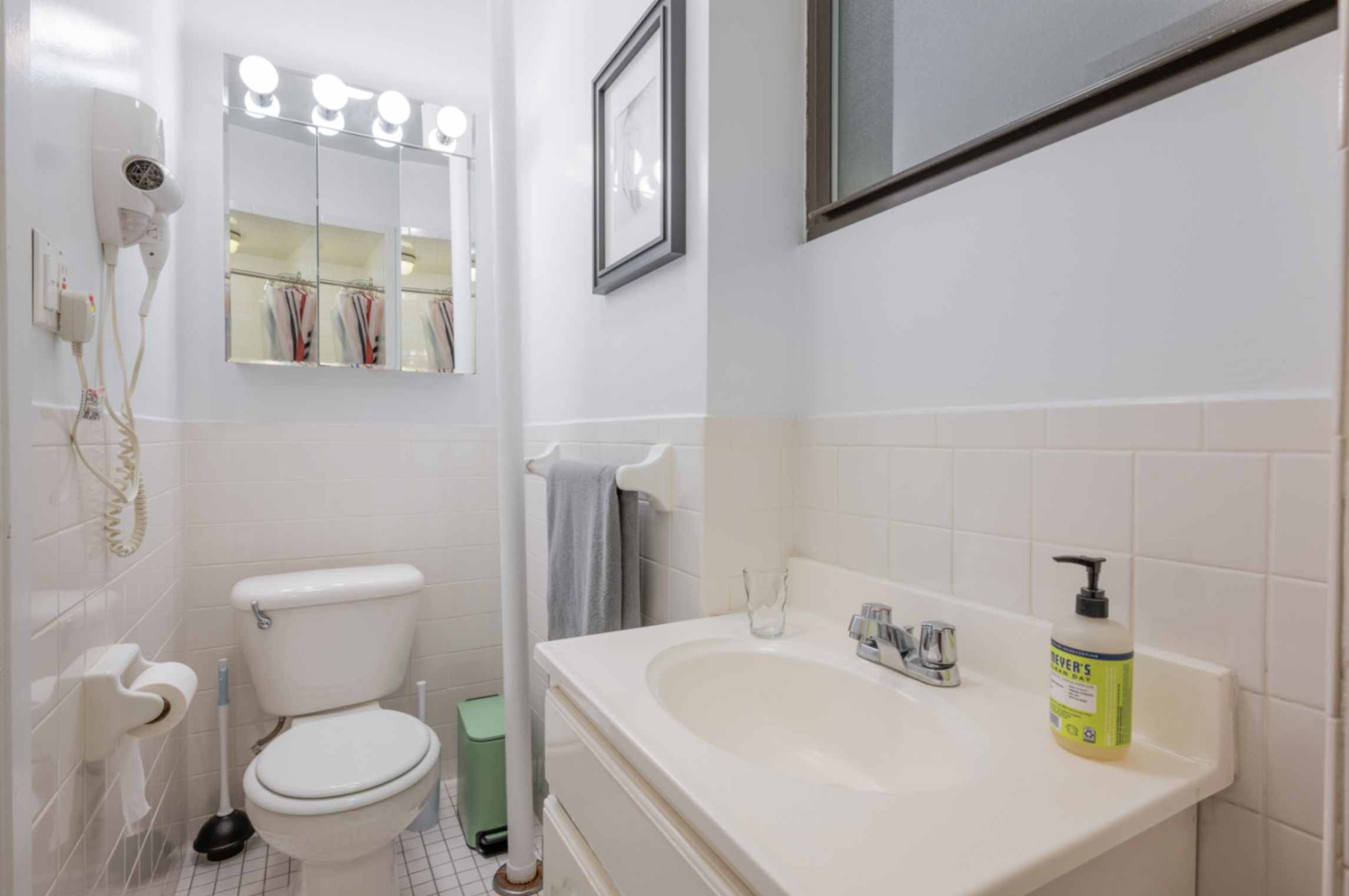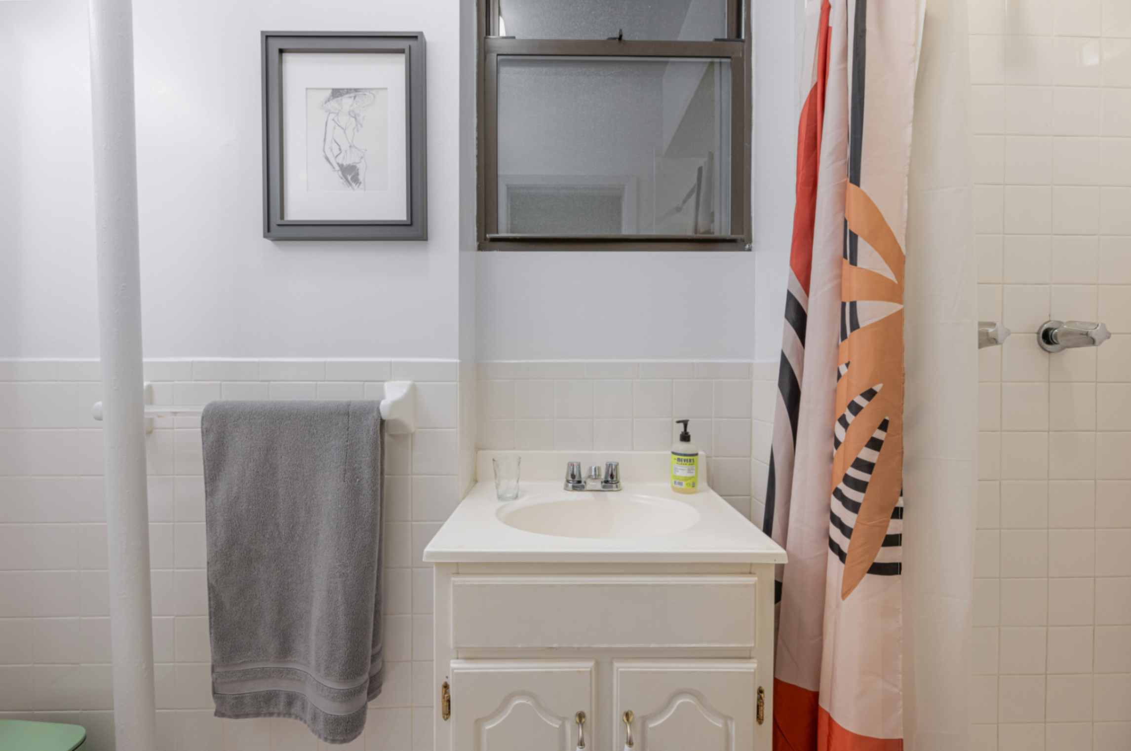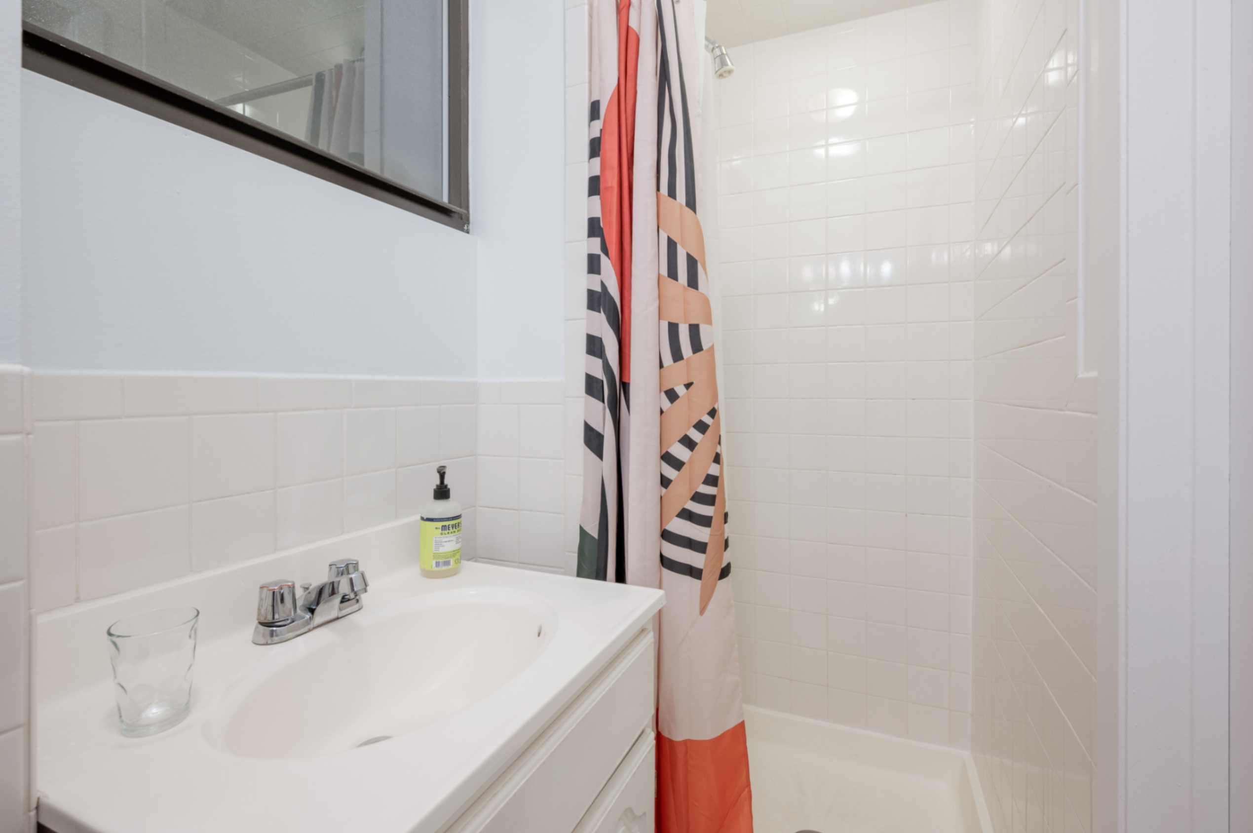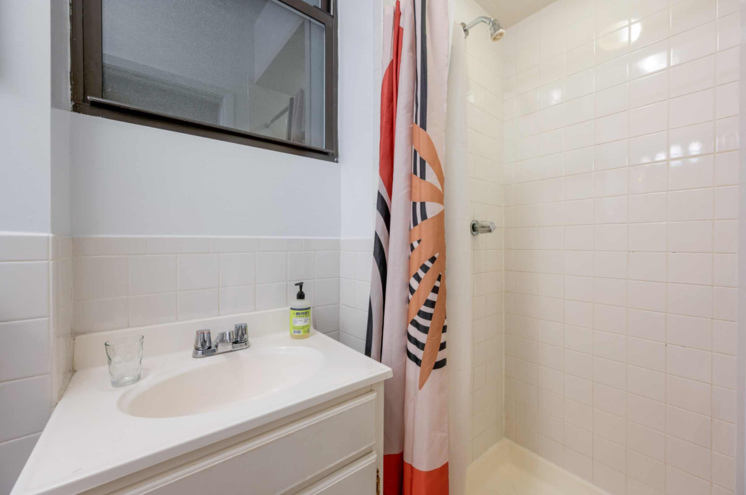 BATHROOM The bathroom is modern and clean, featuring a full-size shower, sink, and all the essentials you need for your stay.
