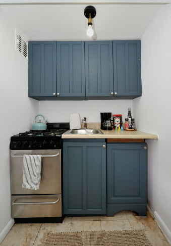 The compact kitchen is equipped with a stove and refrigerator, providing all the essentials for preparing meals.