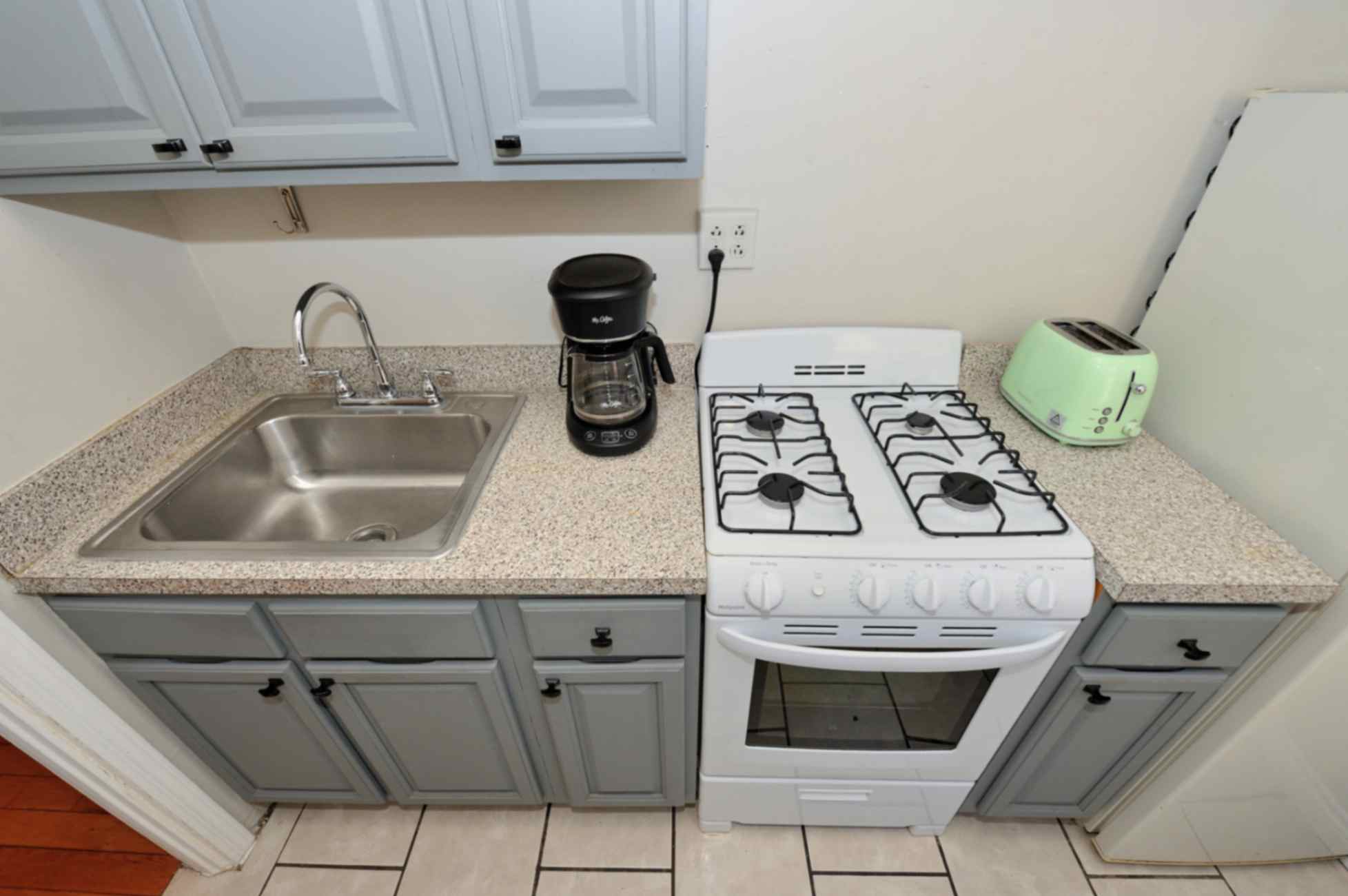 The spotless kitchen is equipped with all essential appliances and tools for convenient meal preparation.