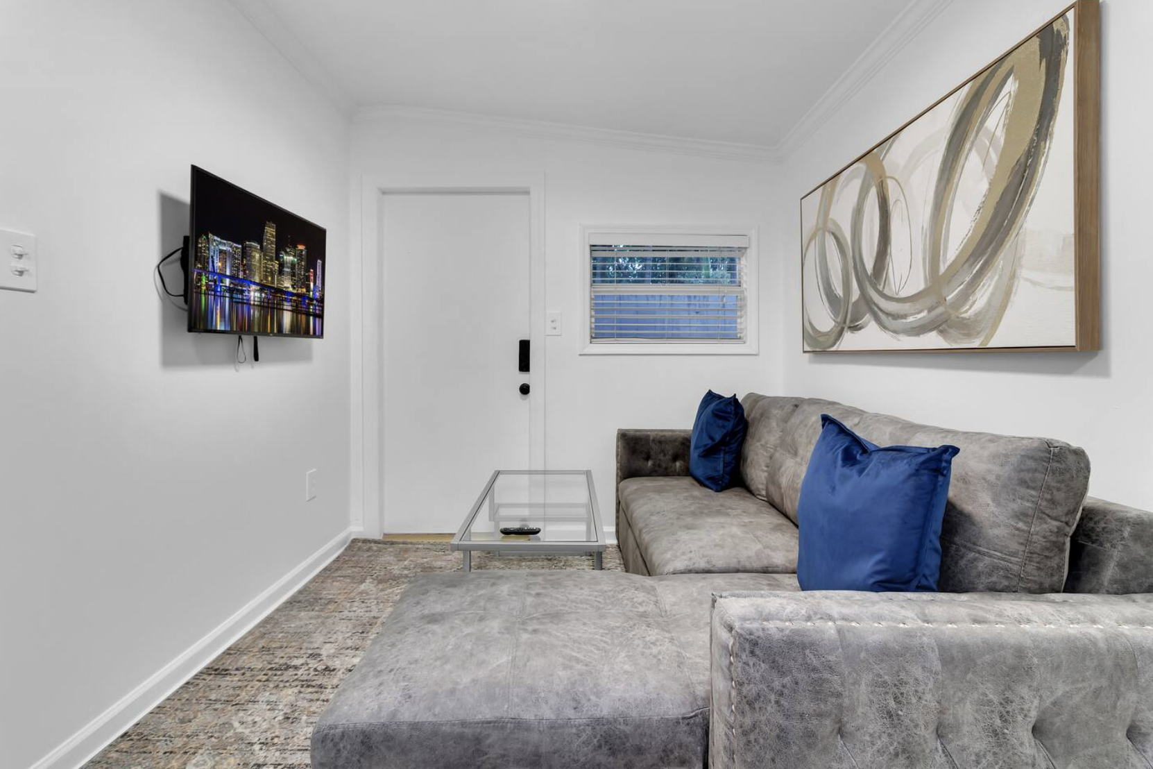 Cozy space with a convertible couch, flat-screen TV, and stylish decor, perfect for relaxation and entertainment.