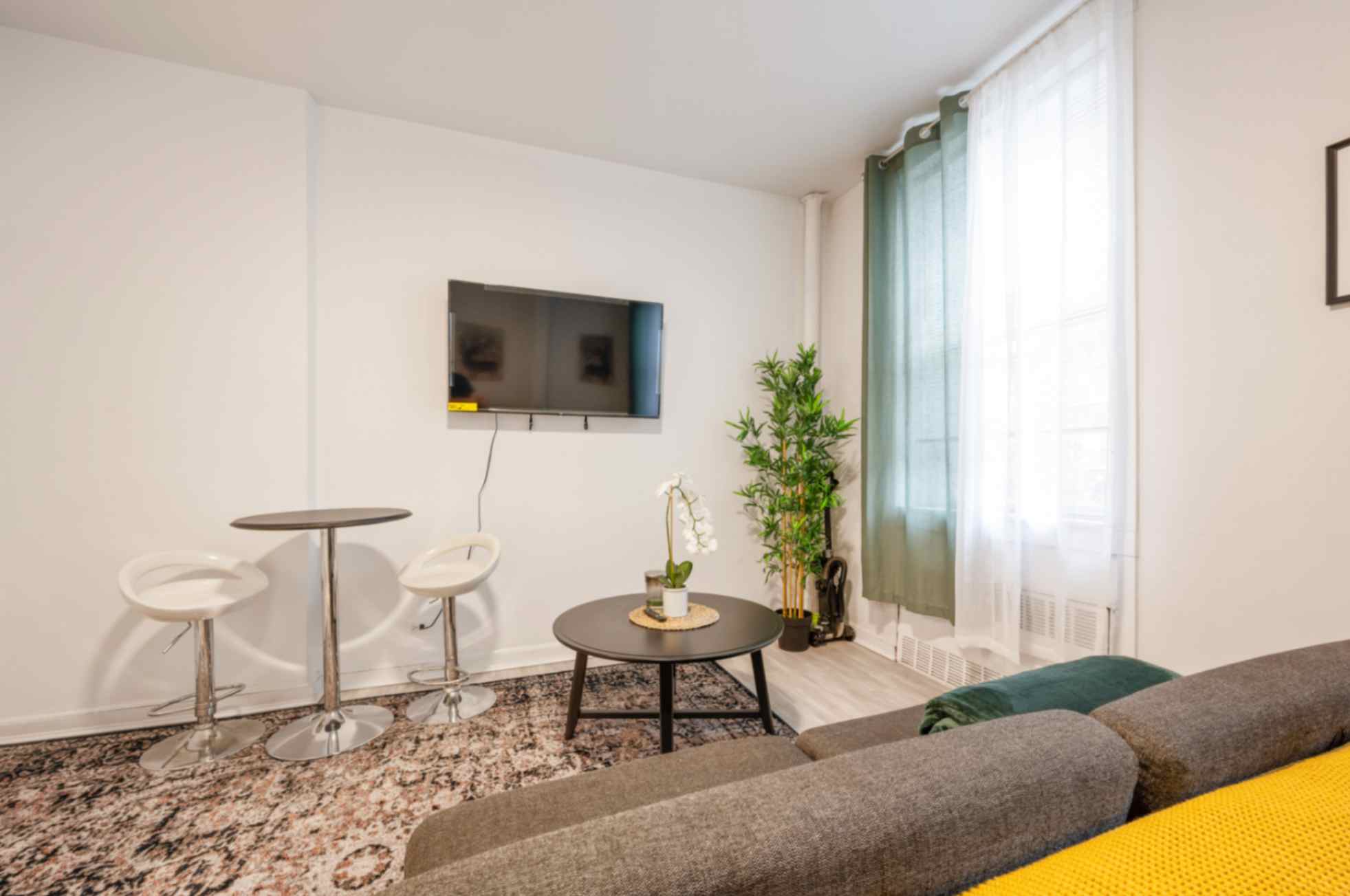 The living area is designed for relaxation and socializing, with the sofa bed providing both seating and additional sleeping options. The space is bright and inviting, perfect for unwinding after a busy day in the city.