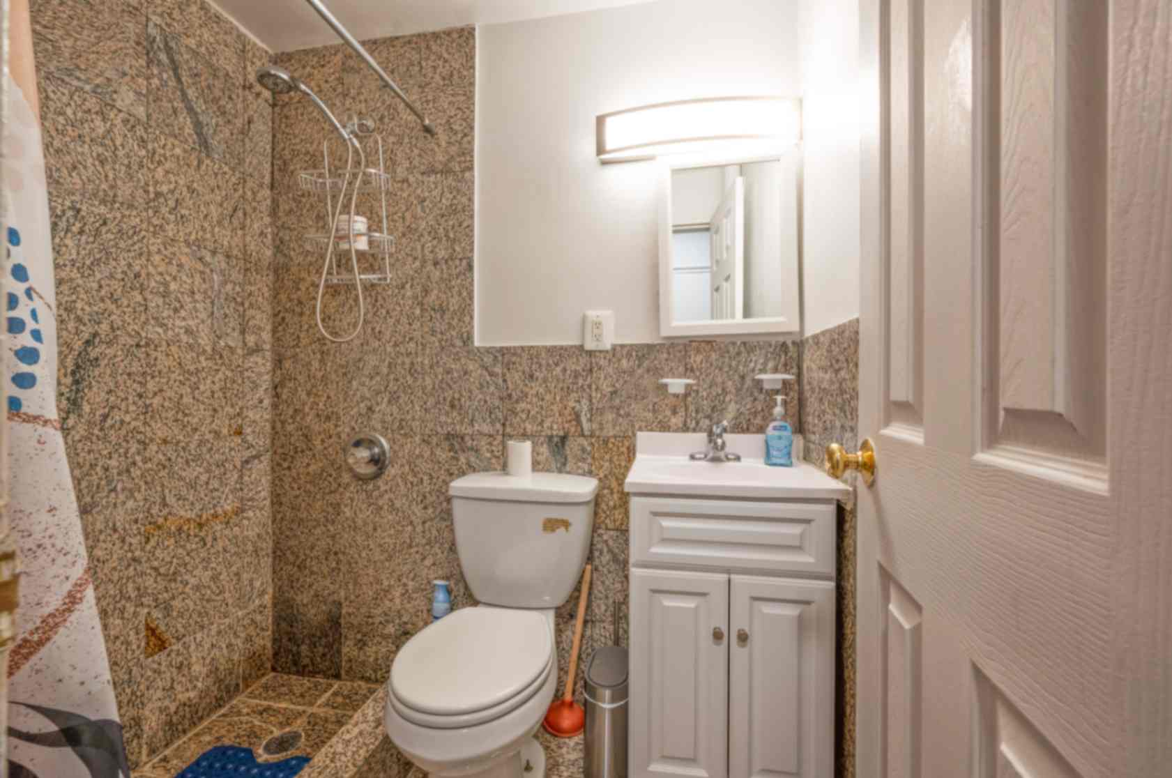 The thoughtfully designed bathroom provides comfort and practicality, featuring modern fixtures and a clean, aesthetic appeal.