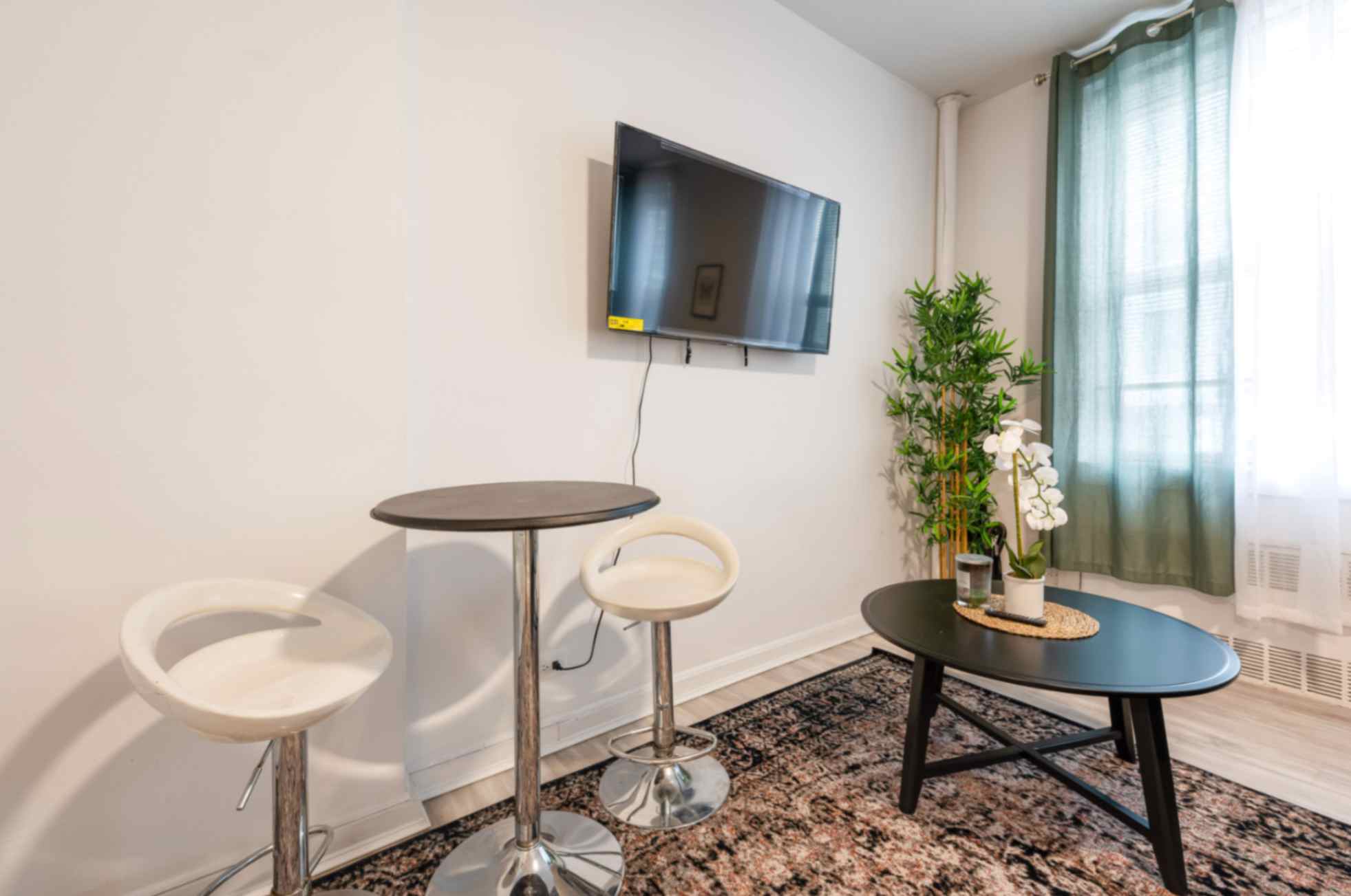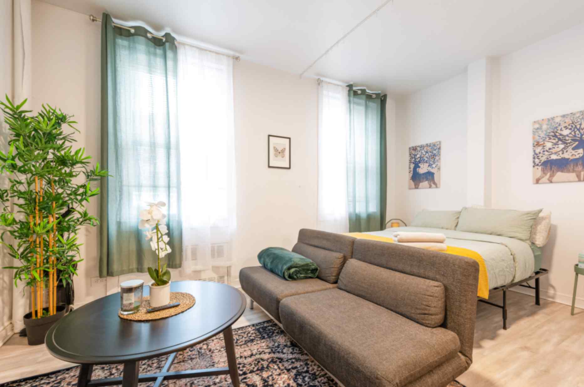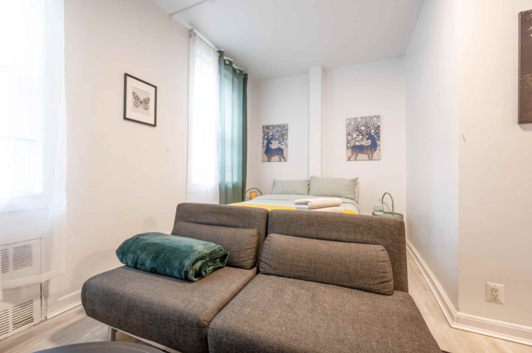 The studio features a cozy queen bed, providing a restful retreat for a good night's sleep. The open layout maximizes space and light, creating a welcoming atmosphere. The addition of a sofa bed offers flexibility for extra guests or a comfortable lounging area.