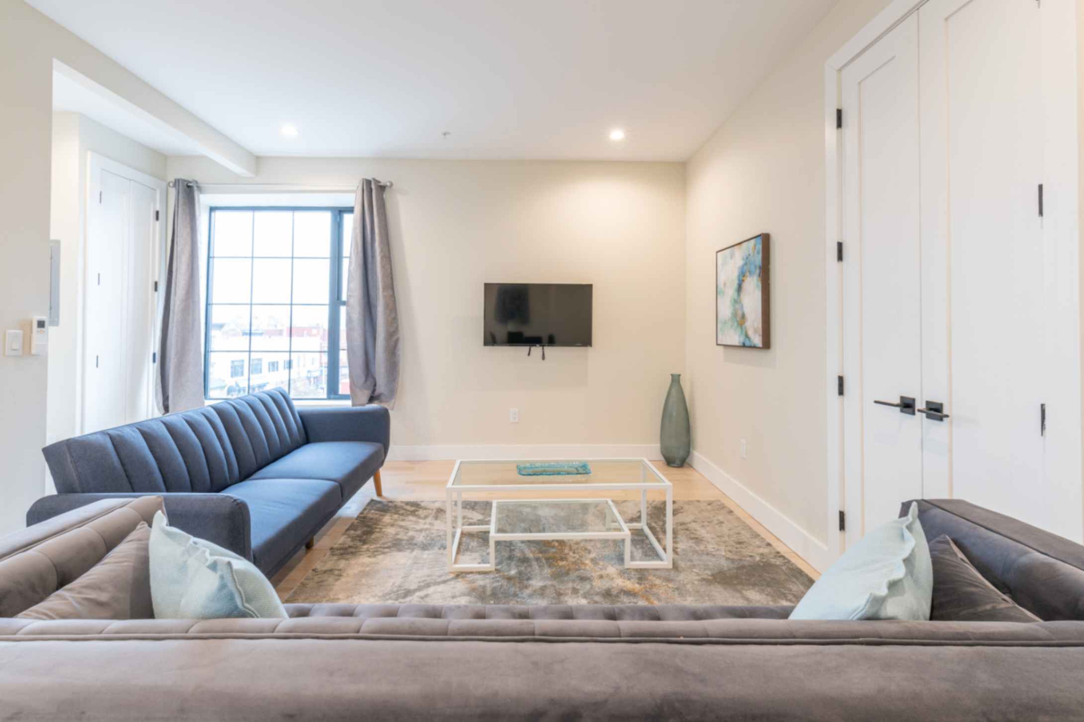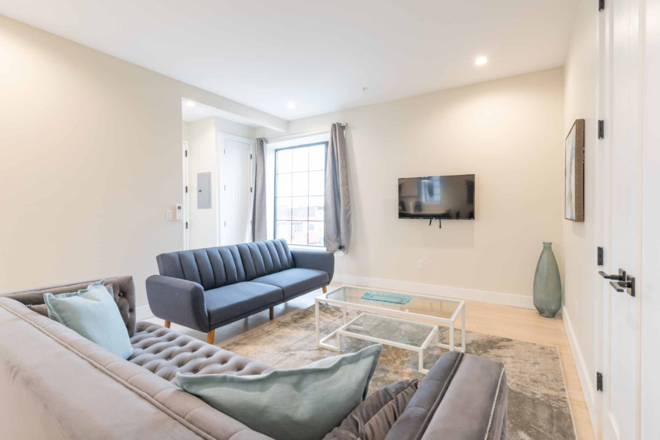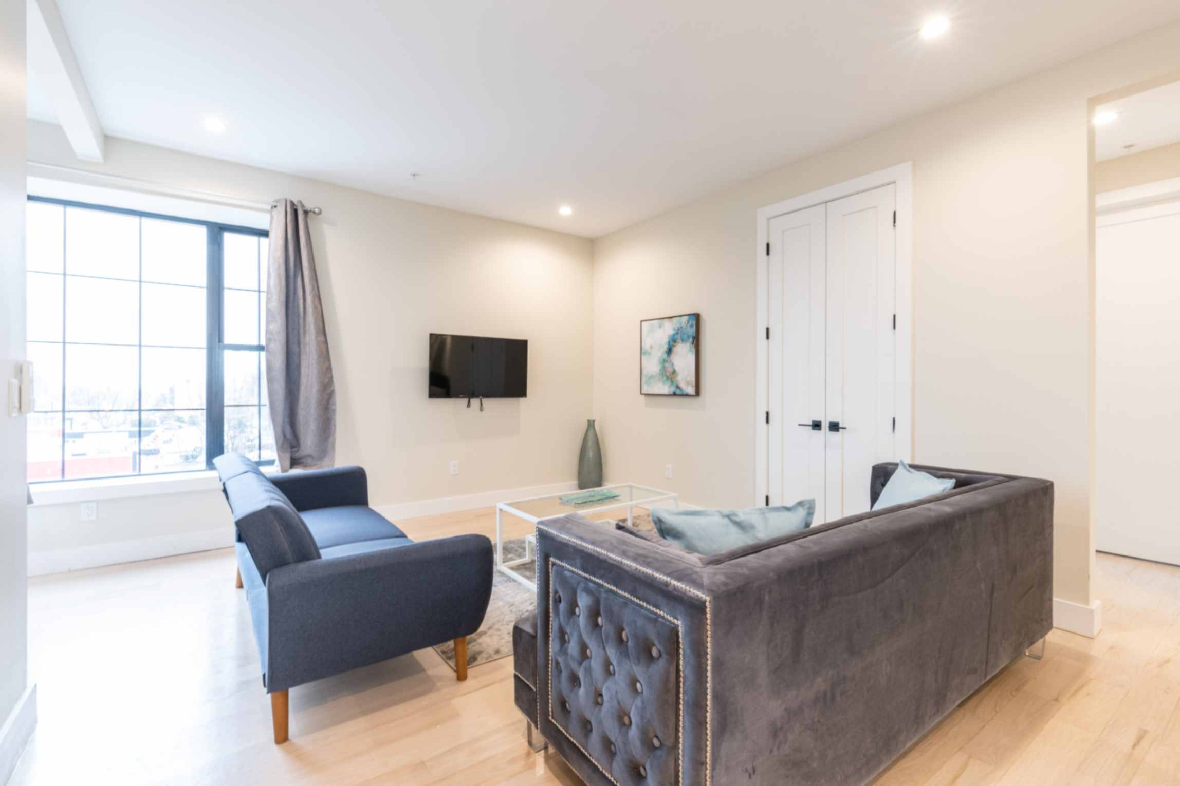 The inviting living room is tastefully furnished, offering a cozy space to relax after a day of exploring the city. Enjoy a flat-screen TV with Netflix access for your entertainment.