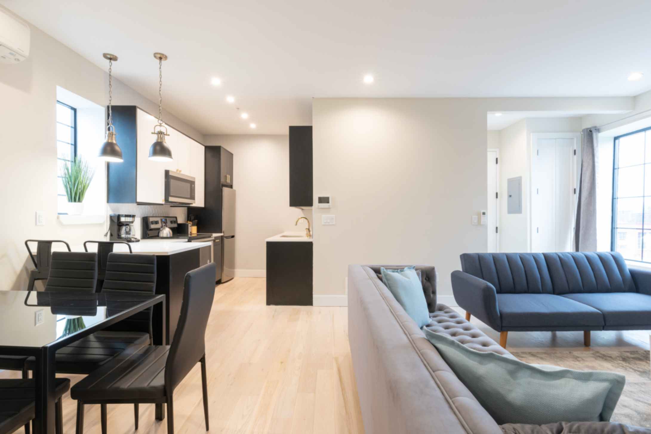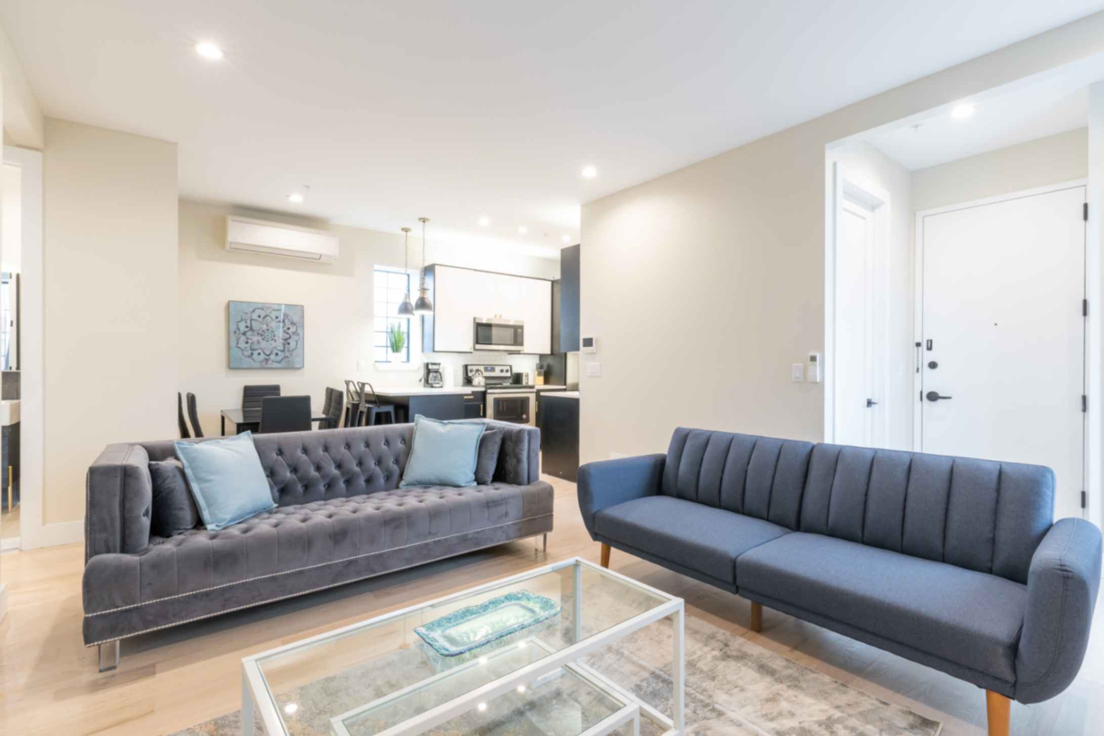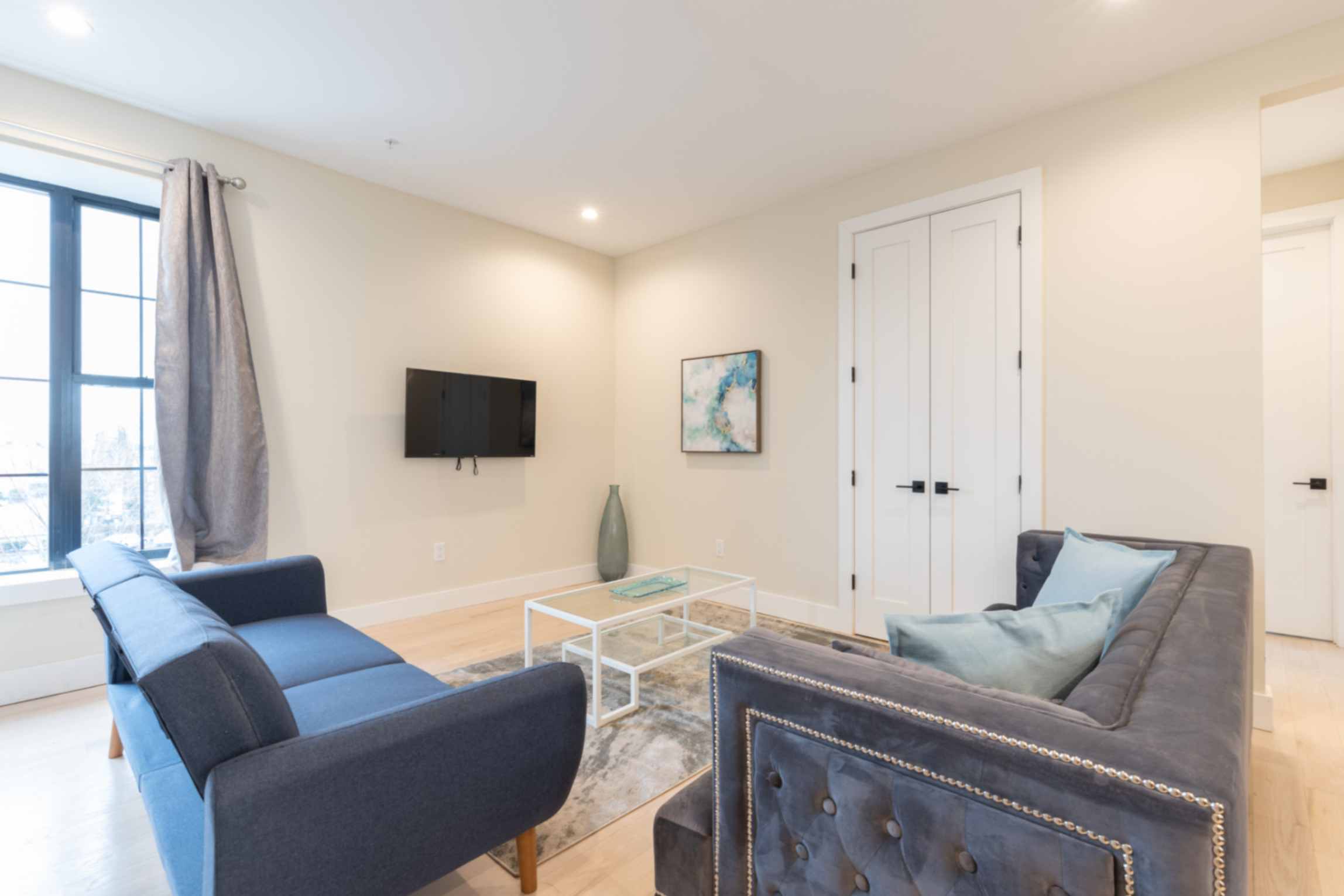 The inviting living room is tastefully furnished, offering a cozy space to relax after a day of exploring the city. Enjoy a flat-screen TV with Netflix access for your entertainment.