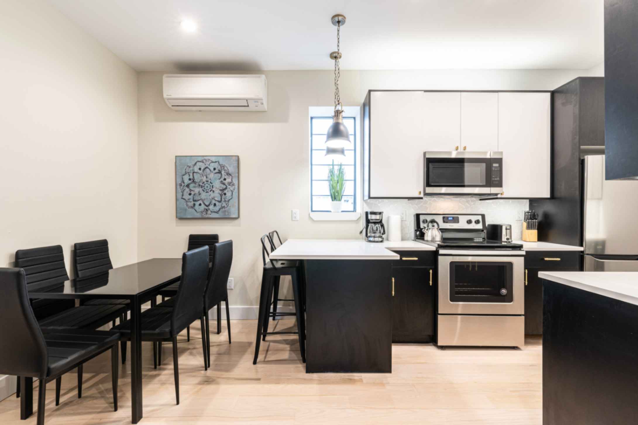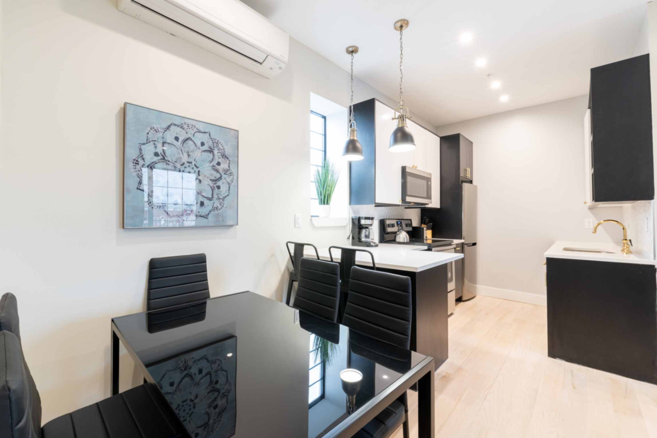 The fully equipped kitchen includes all necessary appliances, with the added luxury of a dishwasher, making culinary endeavors a breeze. The dining area offers a stylish space to enjoy meals with seating for four.