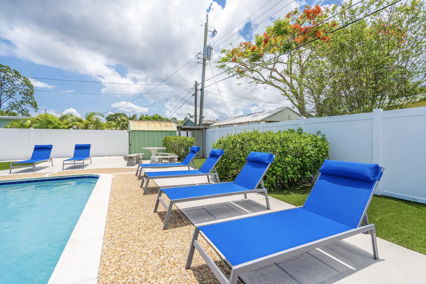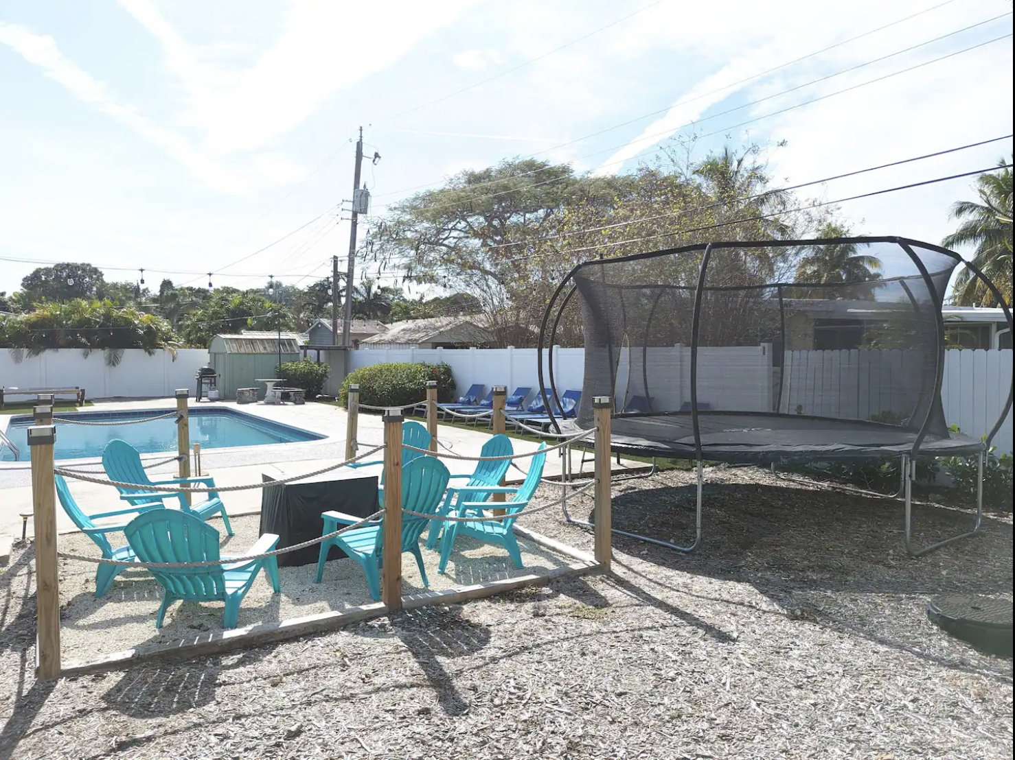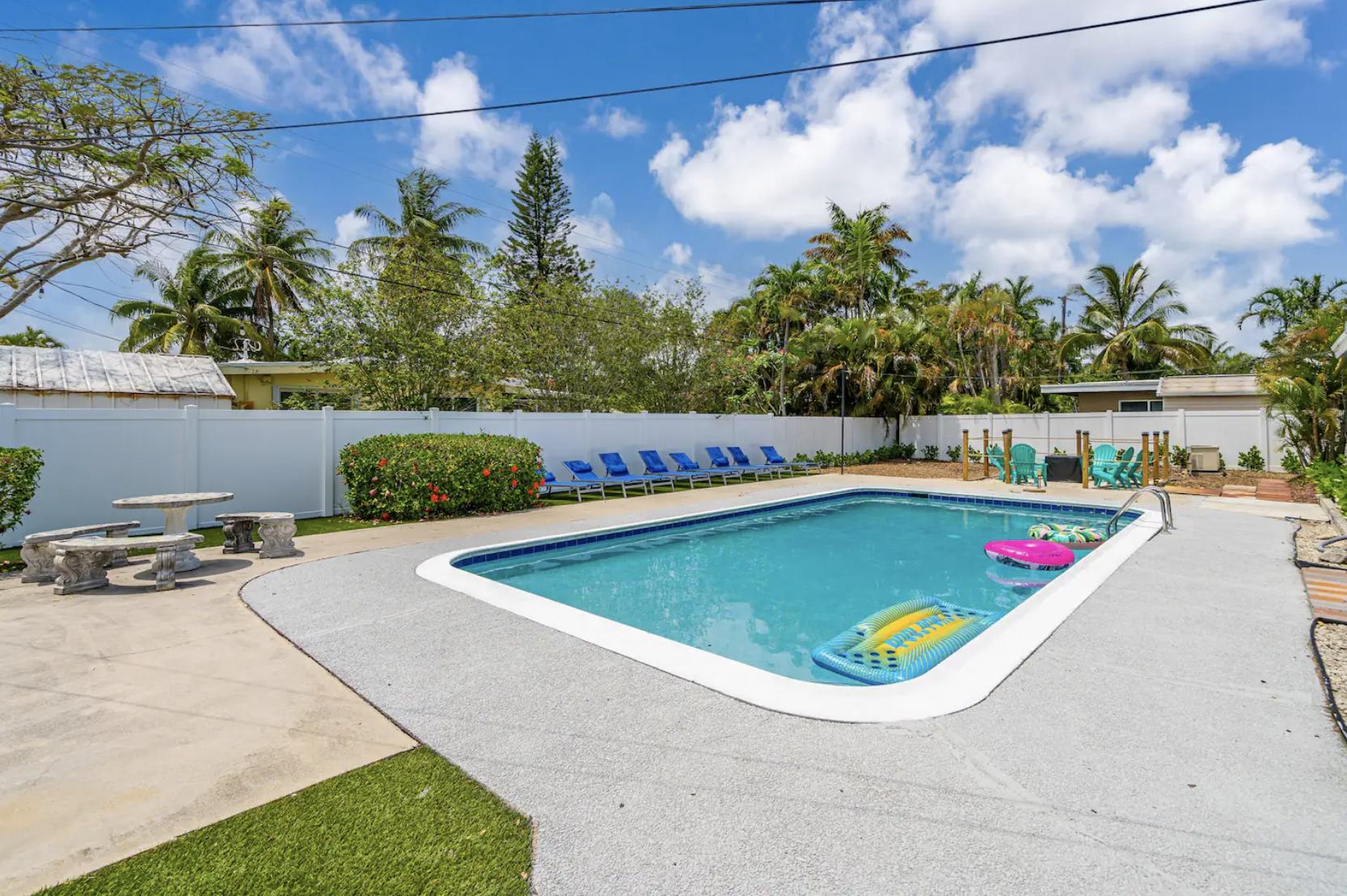 Experience the ultimate Florida getaway in this stunning 3-bedroom, 2-bath home, perfect for families and groups. Enjoy an in-ground pool, a cozy fire pit, and a covered patio for relaxation. Inside, find a spacious living room with a 65-inch TV, a fully equipped kitchen, and a dining area that seats eight. The master suite features a king bed and ensuite bath, while the other rooms offer queen beds. Note: The garage is being transformed into a game room and is under construction. Parking is available for three cars.