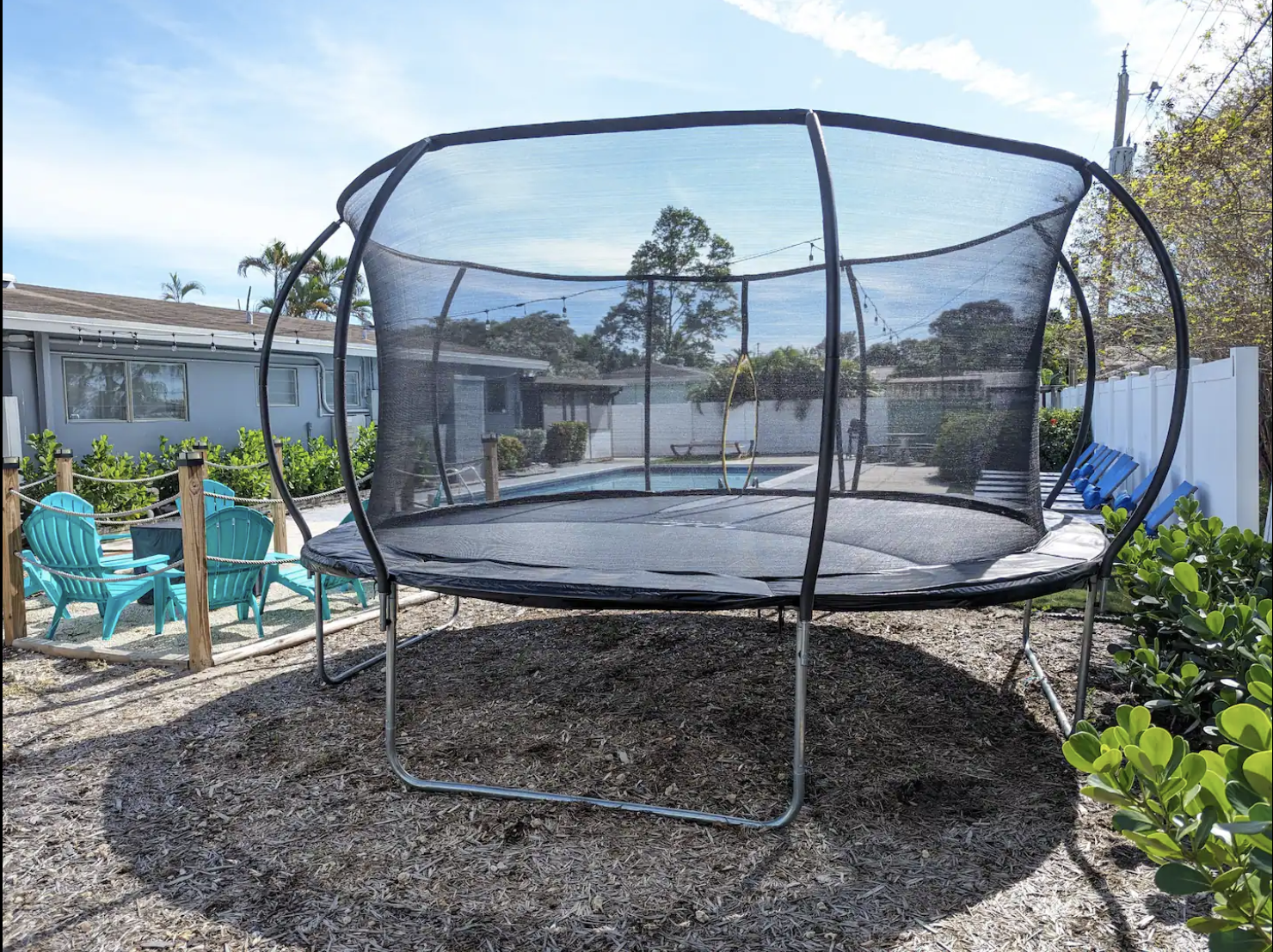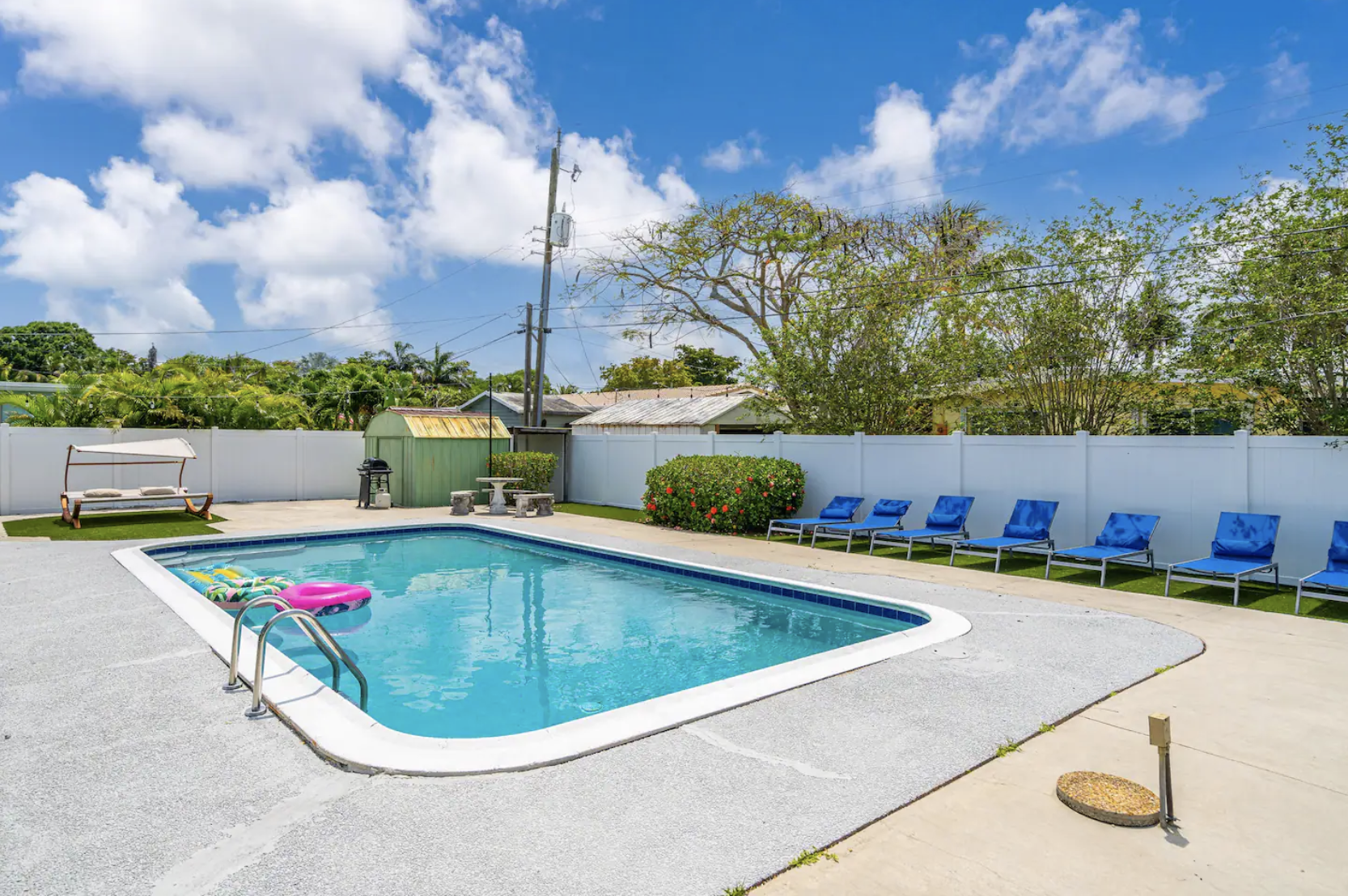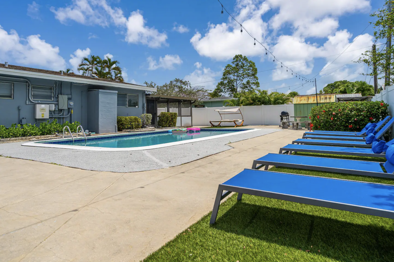 Experience the ultimate Florida getaway in this stunning 3-bedroom, 2-bath home, perfect for families and groups. Enjoy an in-ground pool, a cozy fire pit, and a covered patio for relaxation. Inside, find a spacious living room with a 65-inch TV, a fully equipped kitchen, and a dining area that seats eight. The master suite features a king bed and ensuite bath, while the other rooms offer queen beds. Note: The garage is being transformed into a game room and is under construction. Parking is available for three cars.
