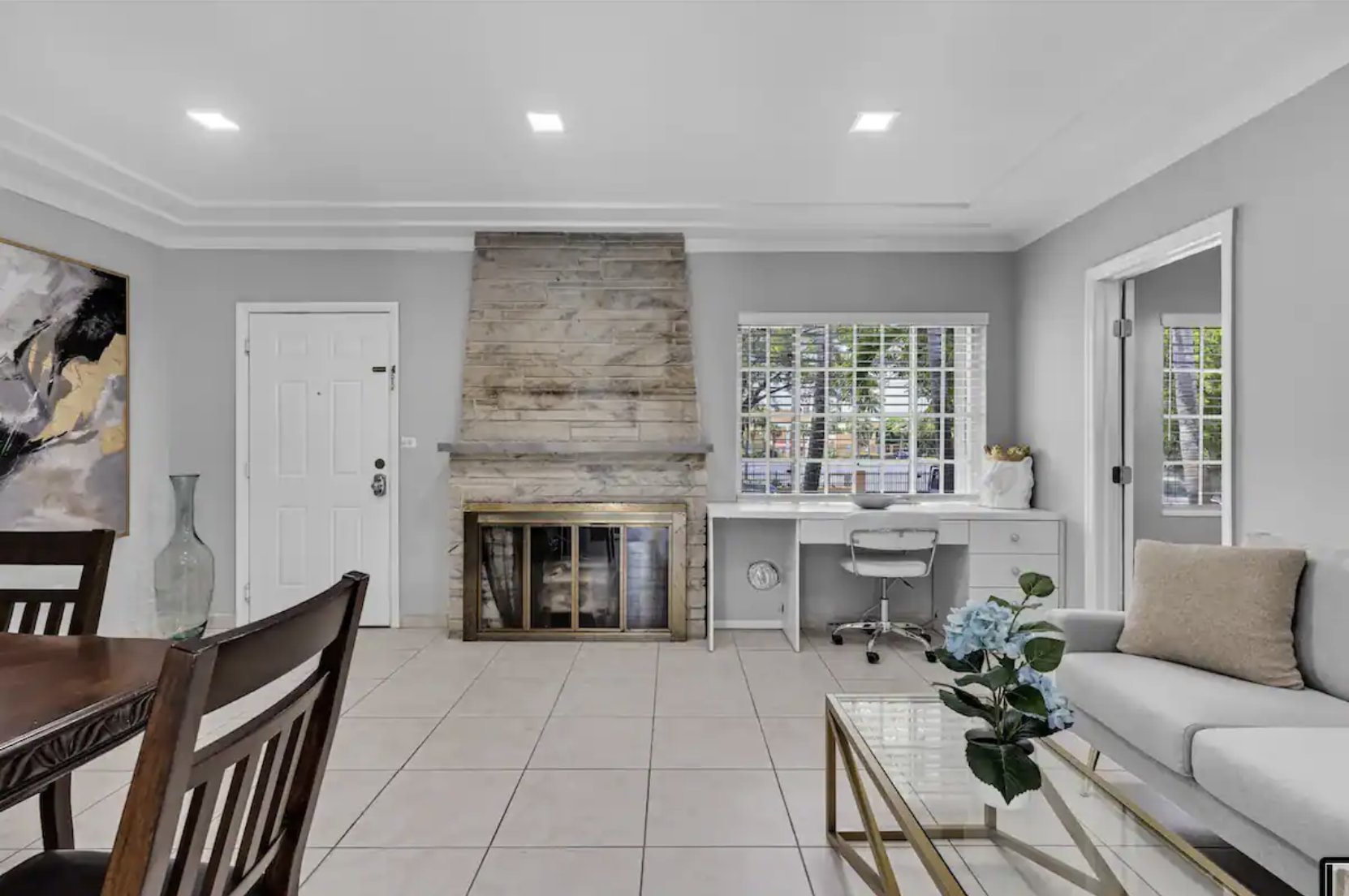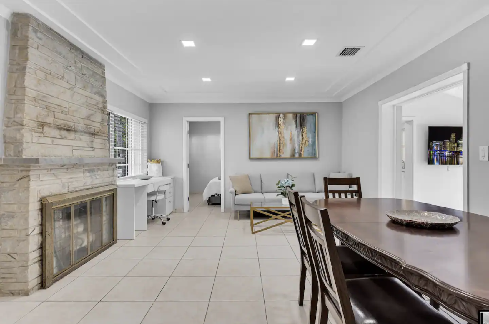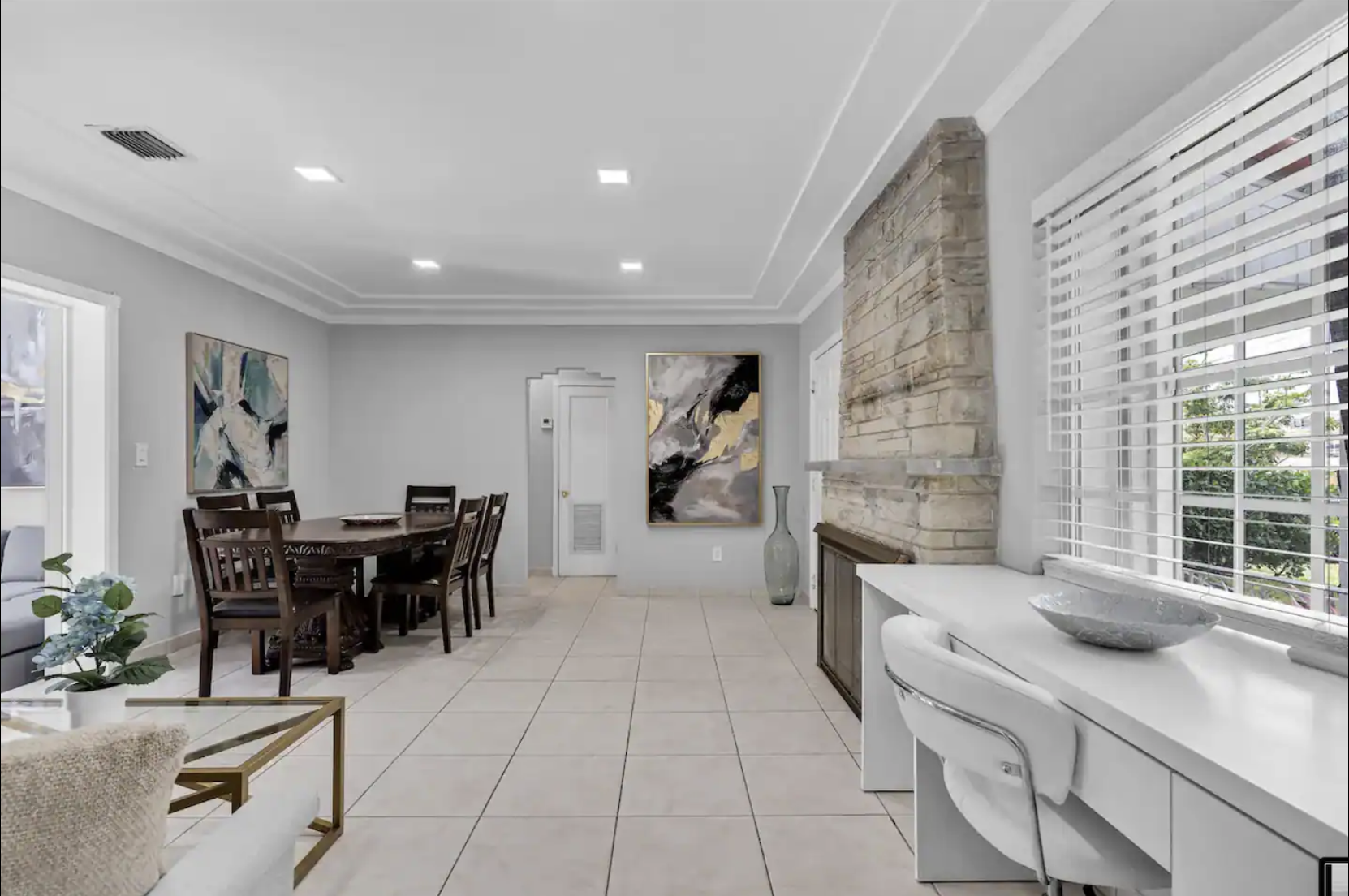 Welcome to our spacious 4-bedroom, 2-bathroom retreat in the prestigious Miami Shores, where luxury meets comfort. This inviting home is designed for memorable gatherings and shared meals, featuring a grand main space with a dining area, faux fireplace, comfortable couch, and a dining table for six.