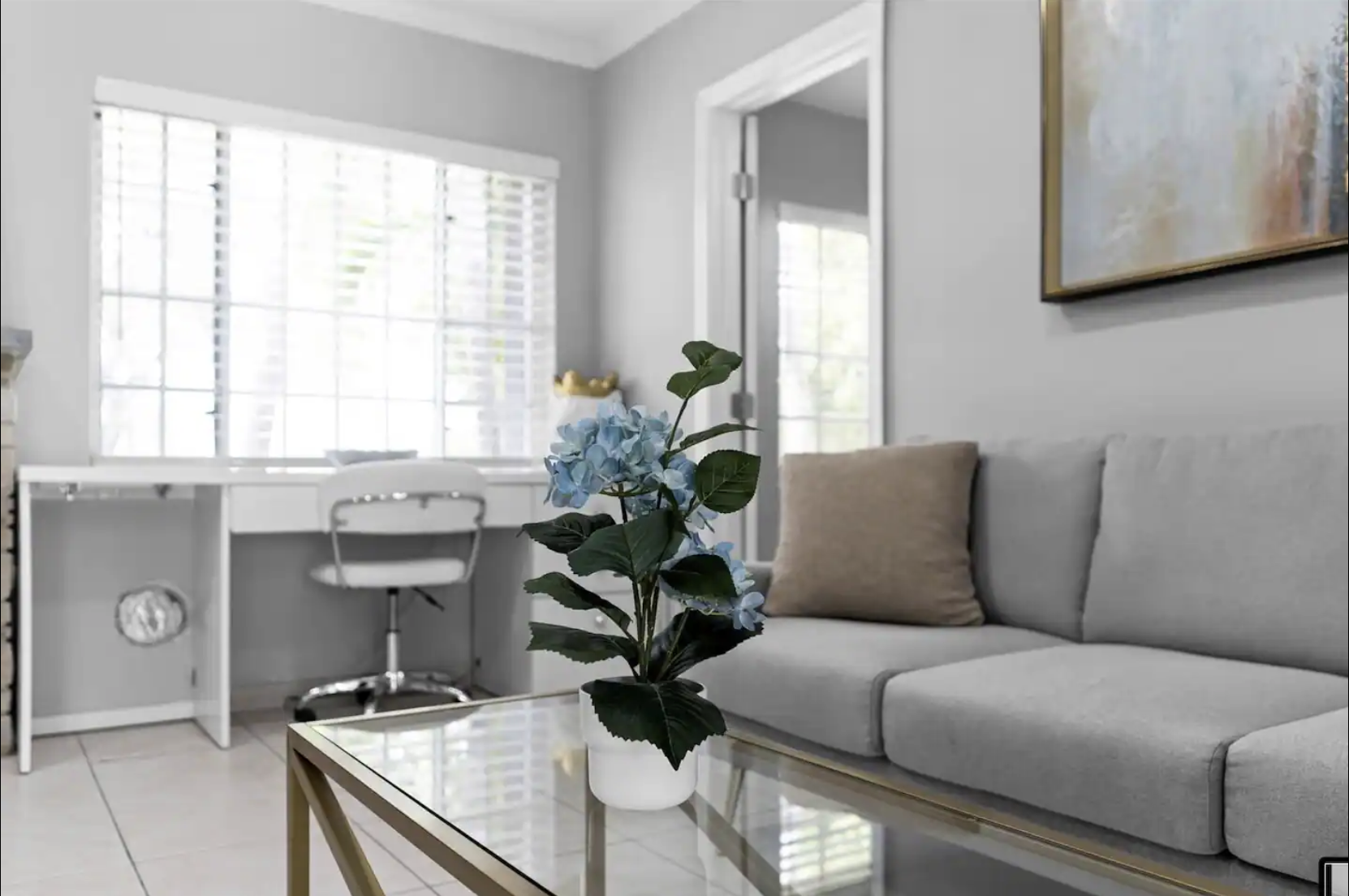 ☀️Living Room: Spacious living area with a comfortable couch and a large flat-screen TV with Netflix.