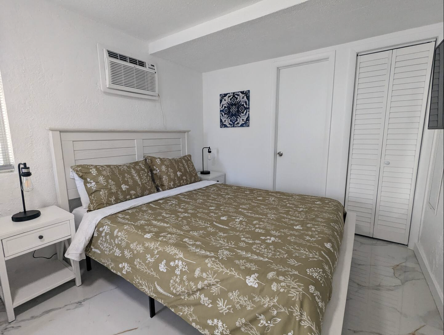 Your comfort is paramount in our serene queen bedroom. Recharge on the plush bed and enjoy your favorite shows on the 43-inch flat-screen TV, a modern touch to your restful space. The apartment's fresh, white theme, accented with sophisticated gold streaks in the tile flooring, creates a peaceful and upscale atmosphere.