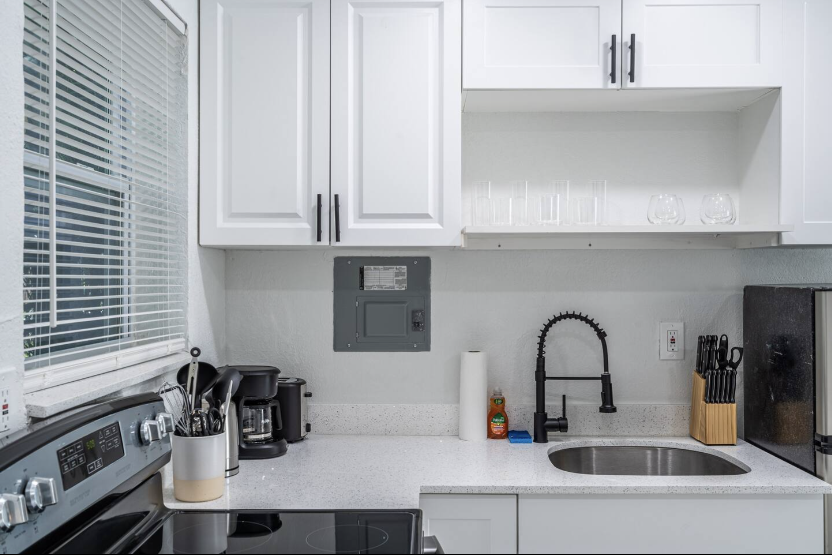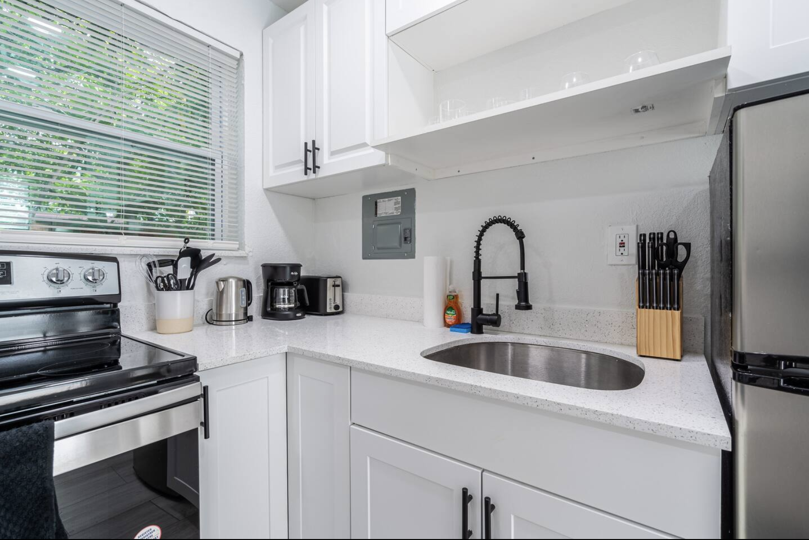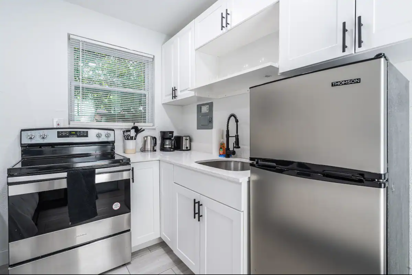 The fully equipped kitchen includes a cooktop and basic tools, allowing you to prepare meals at your convenience.