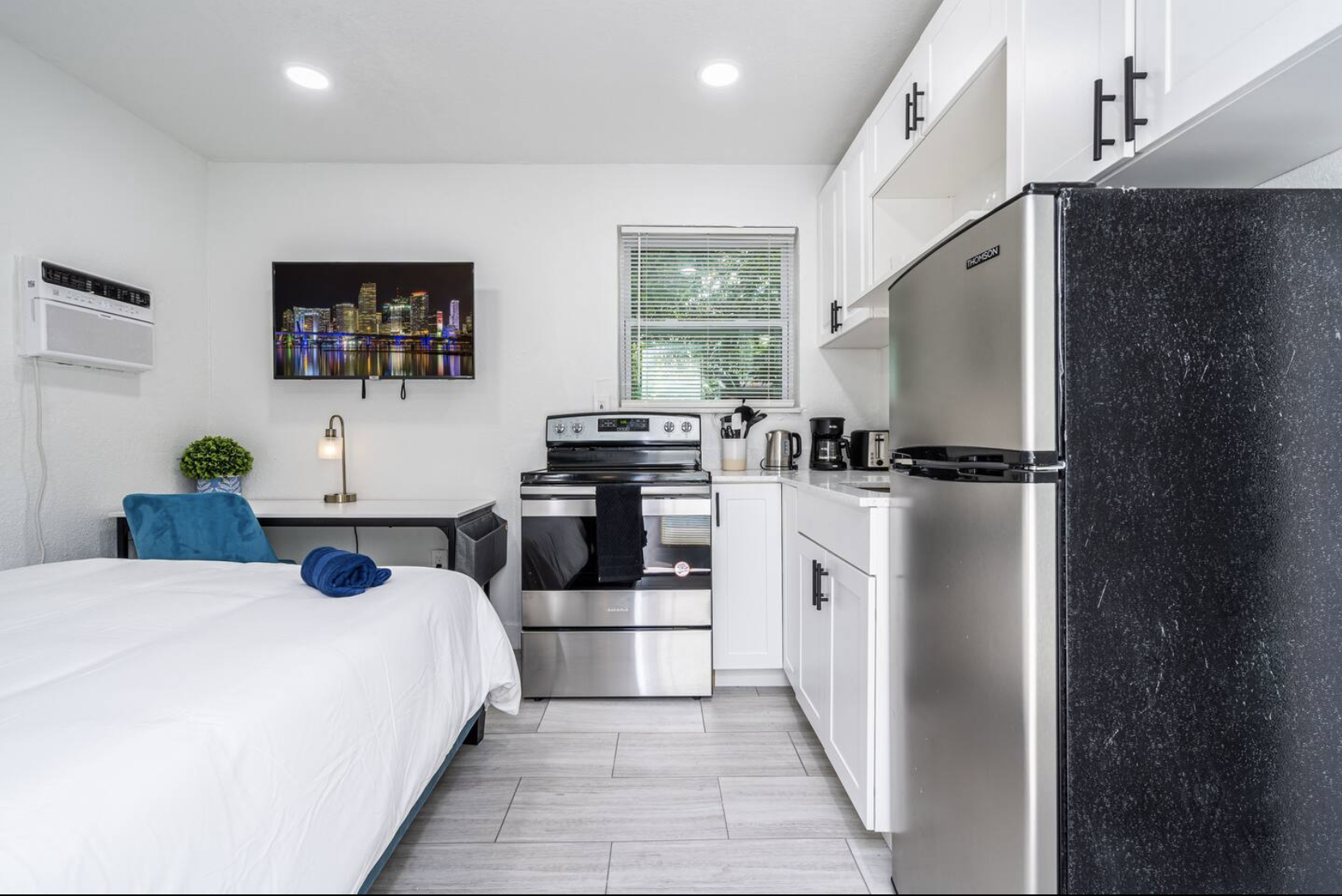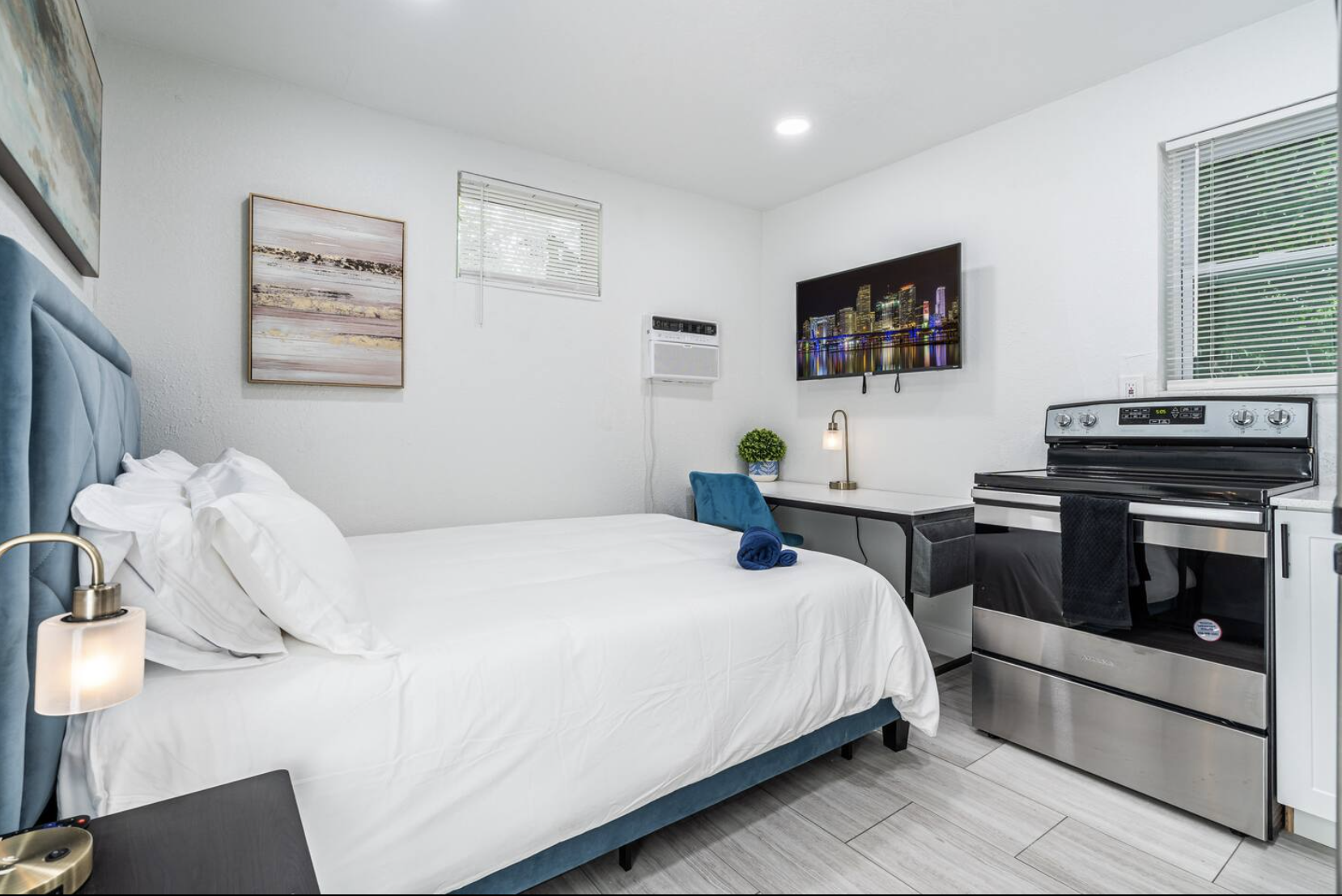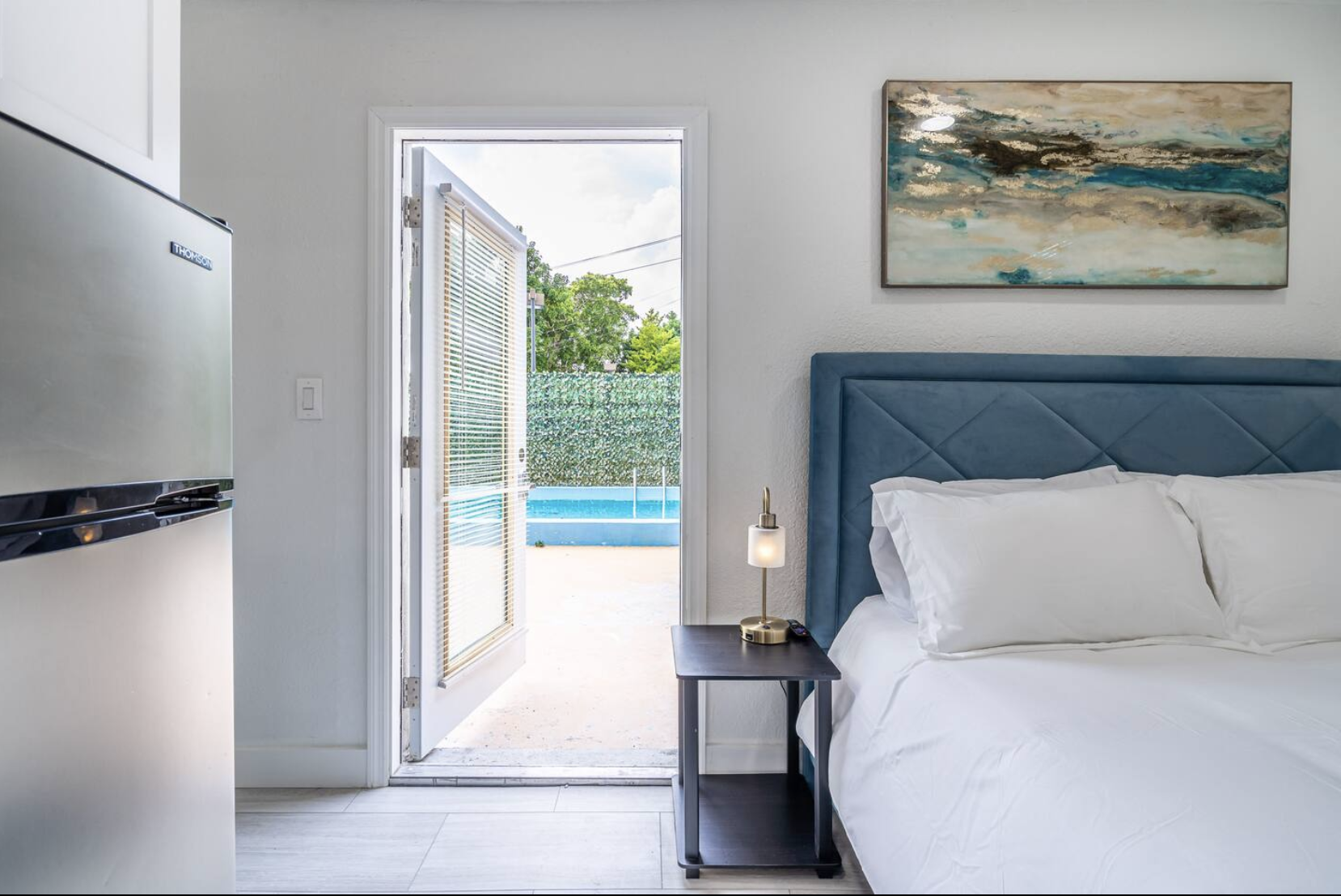 Welcome to our charming studio apartment, situated at the rear of a spacious multi-family property. Enjoy a peaceful stay offering privacy and comfort. Rest comfortably on the cozy queen bed and utilize the closet for your belongings. The kitchen is equipped with basic tools, including a cooktop, allowing you to prepare meals. Step outside to the shared pool space with lounge chairs, a patio, outdoor dining, and an umbrella. High-speed WiFi is available throughout. Book now and experience the comfort and convenience of this tranquil retreat.
