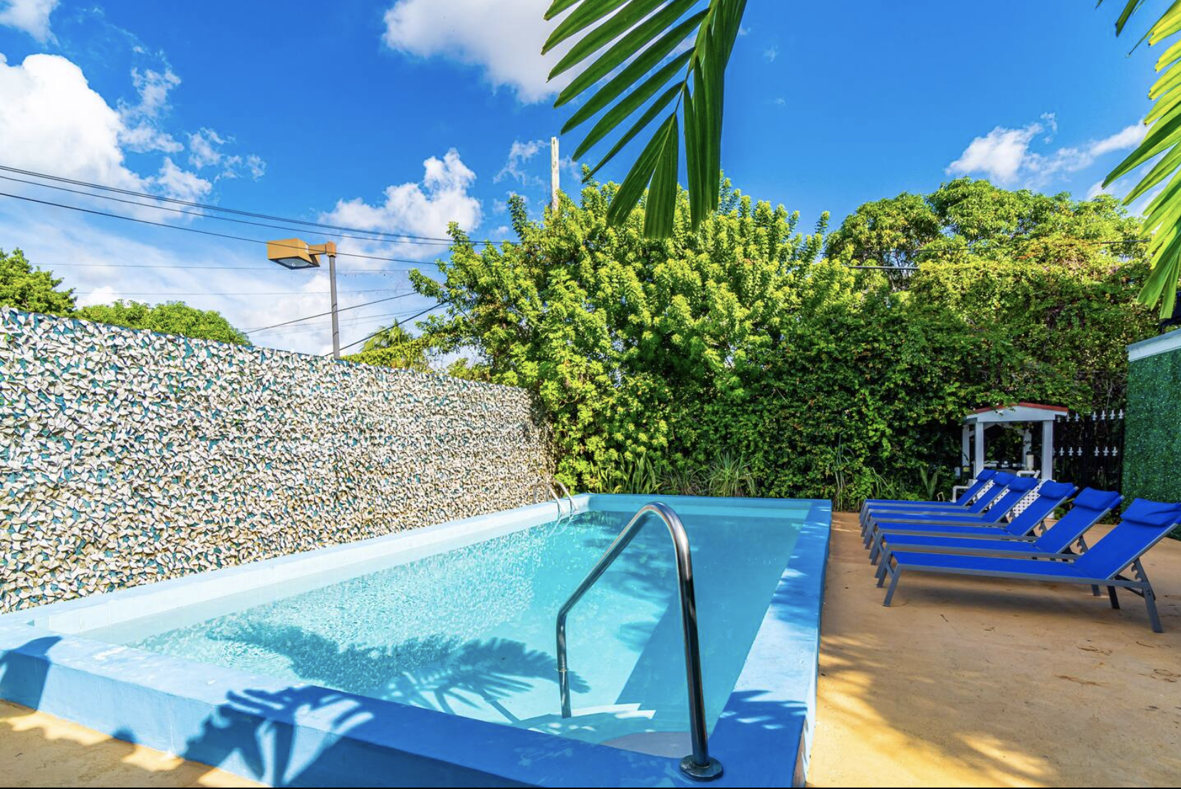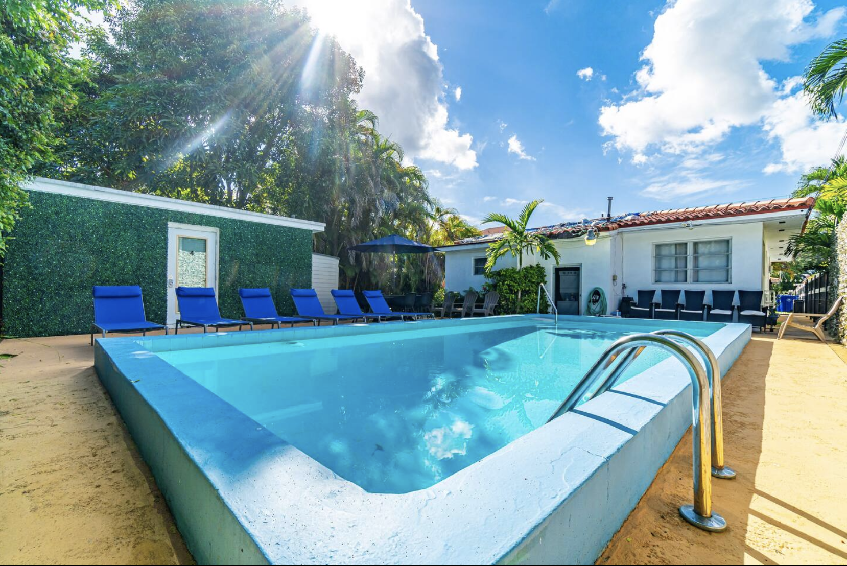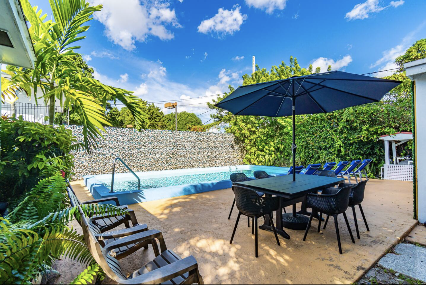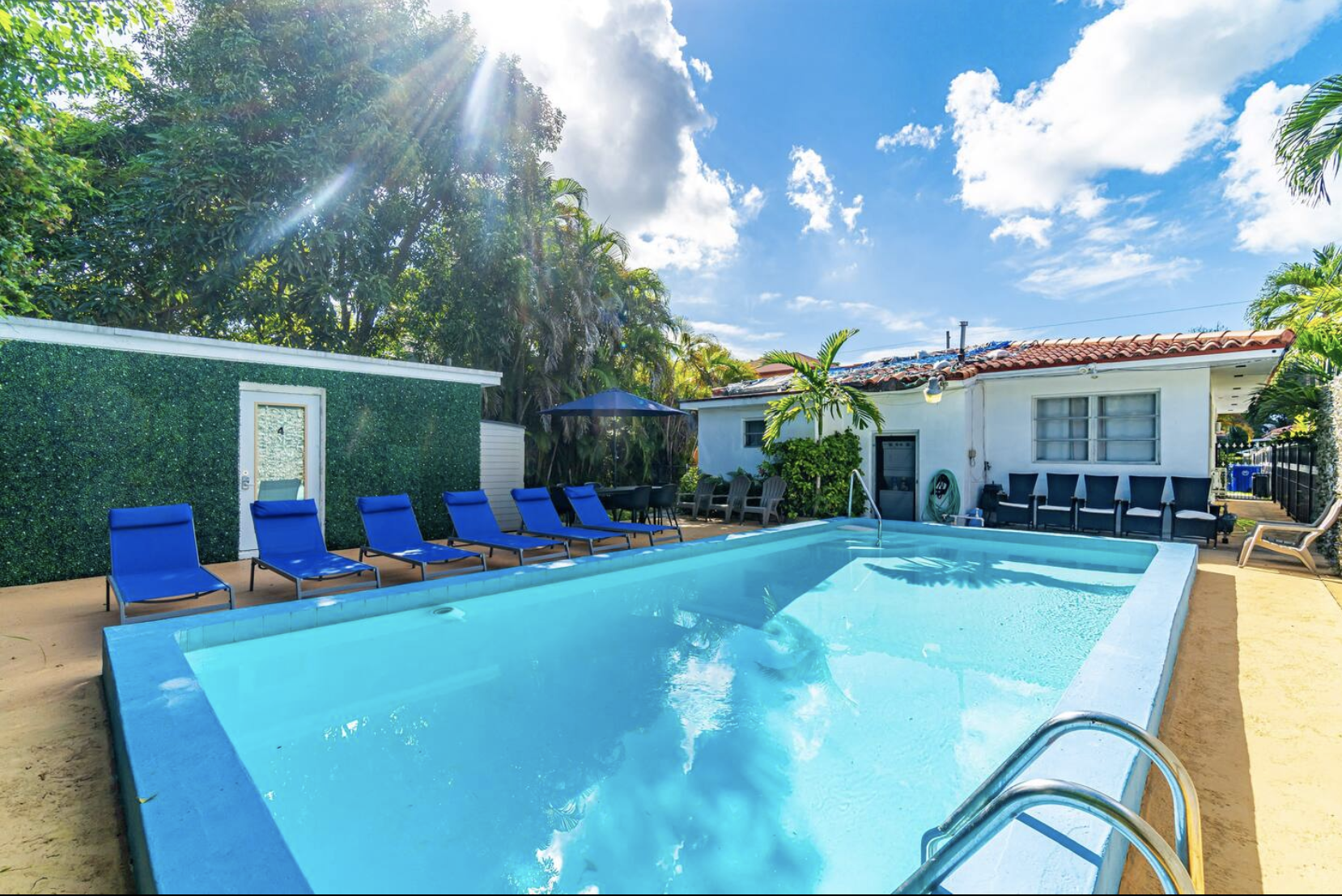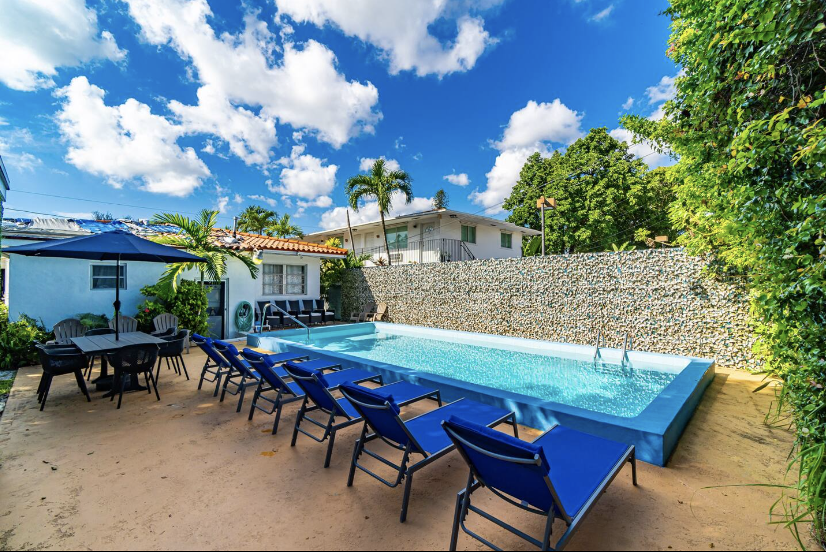 The shared pool space includes lounge chairs, a patio, and an outdoor dining area, providing opportunities for relaxation and socializing.