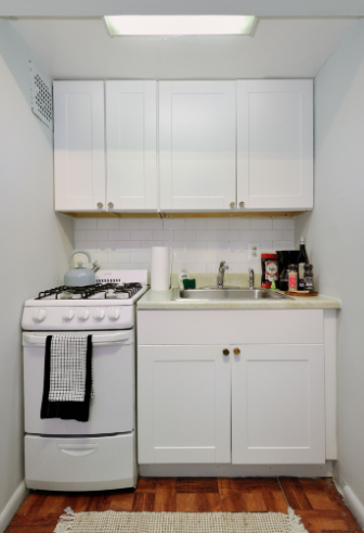 The compact kitchen is equipped with a stove and refrigerator, providing all the essentials for preparing meals.
