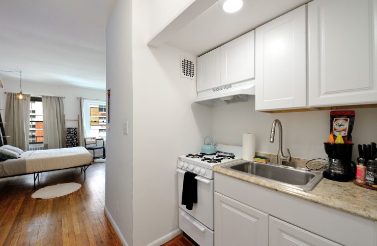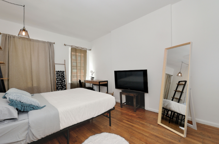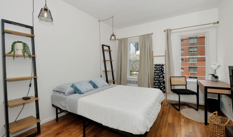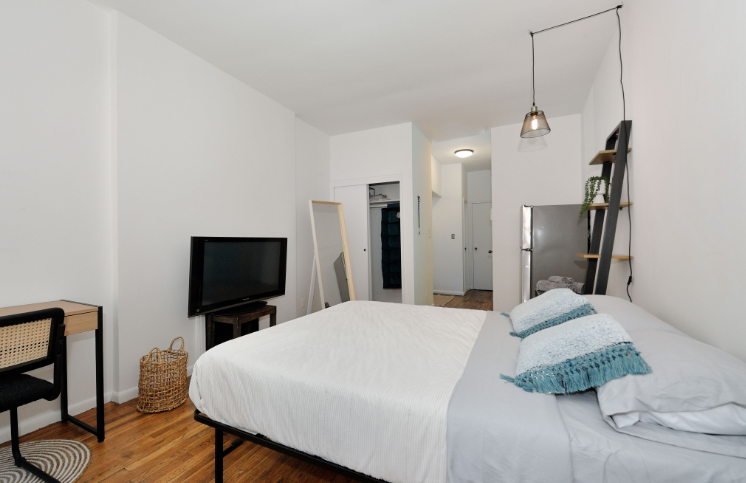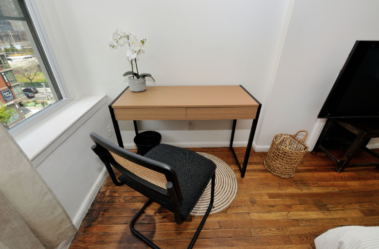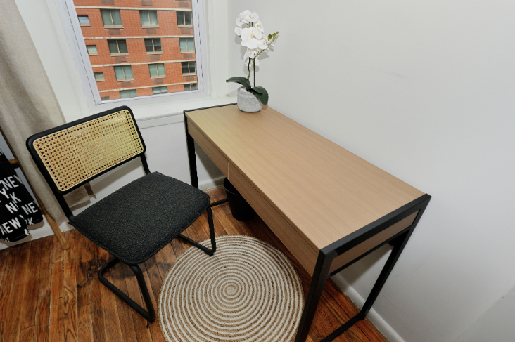 Charming third-floor studio in the heart of Hudson Yards, thoughtfully designed with an open layout that blends functionality with style. This space features a compact kitchen with a stove and refrigerator, a cozy relaxation area, a small desk, and a bathroom. An air mattress for a third person is available upon request.