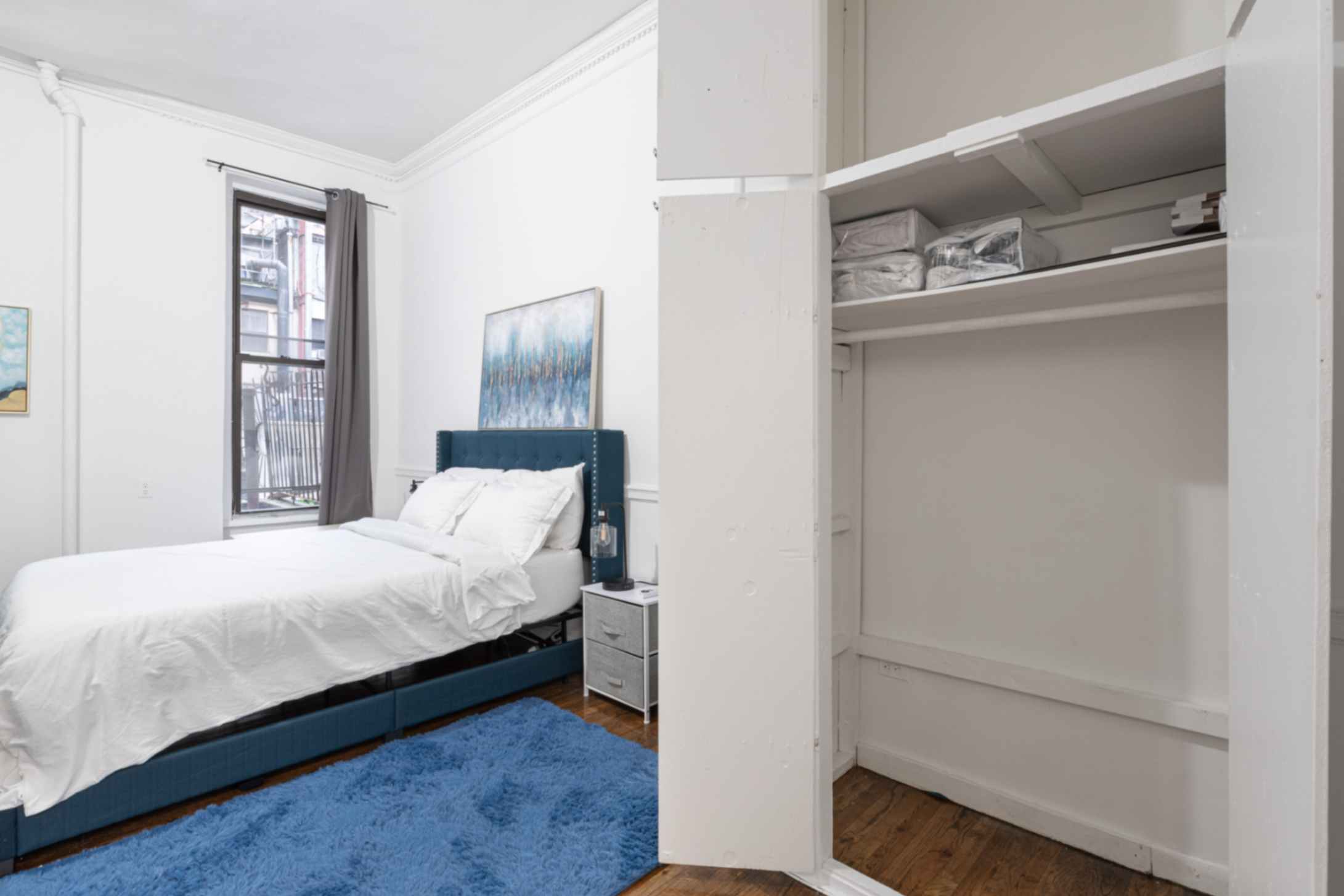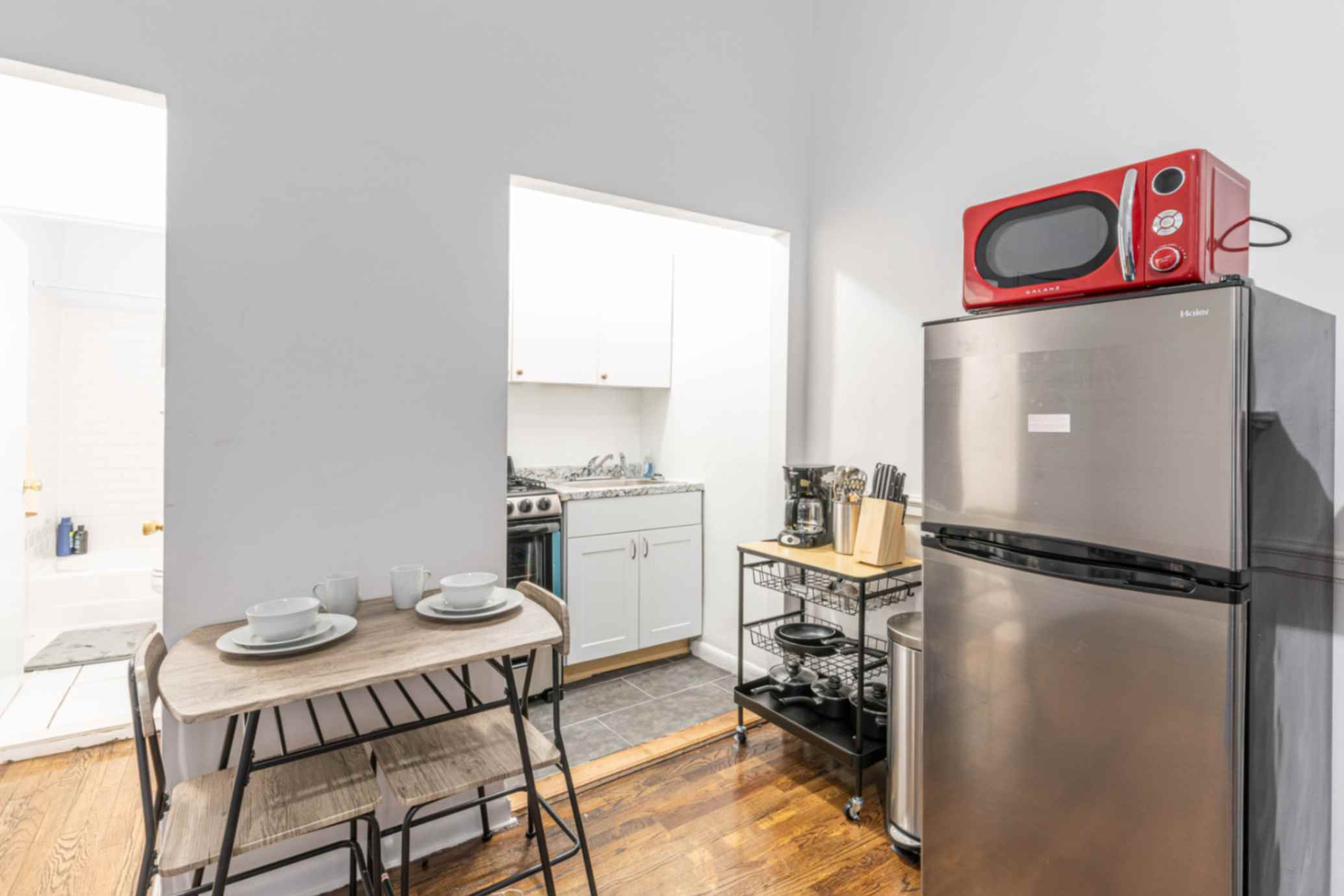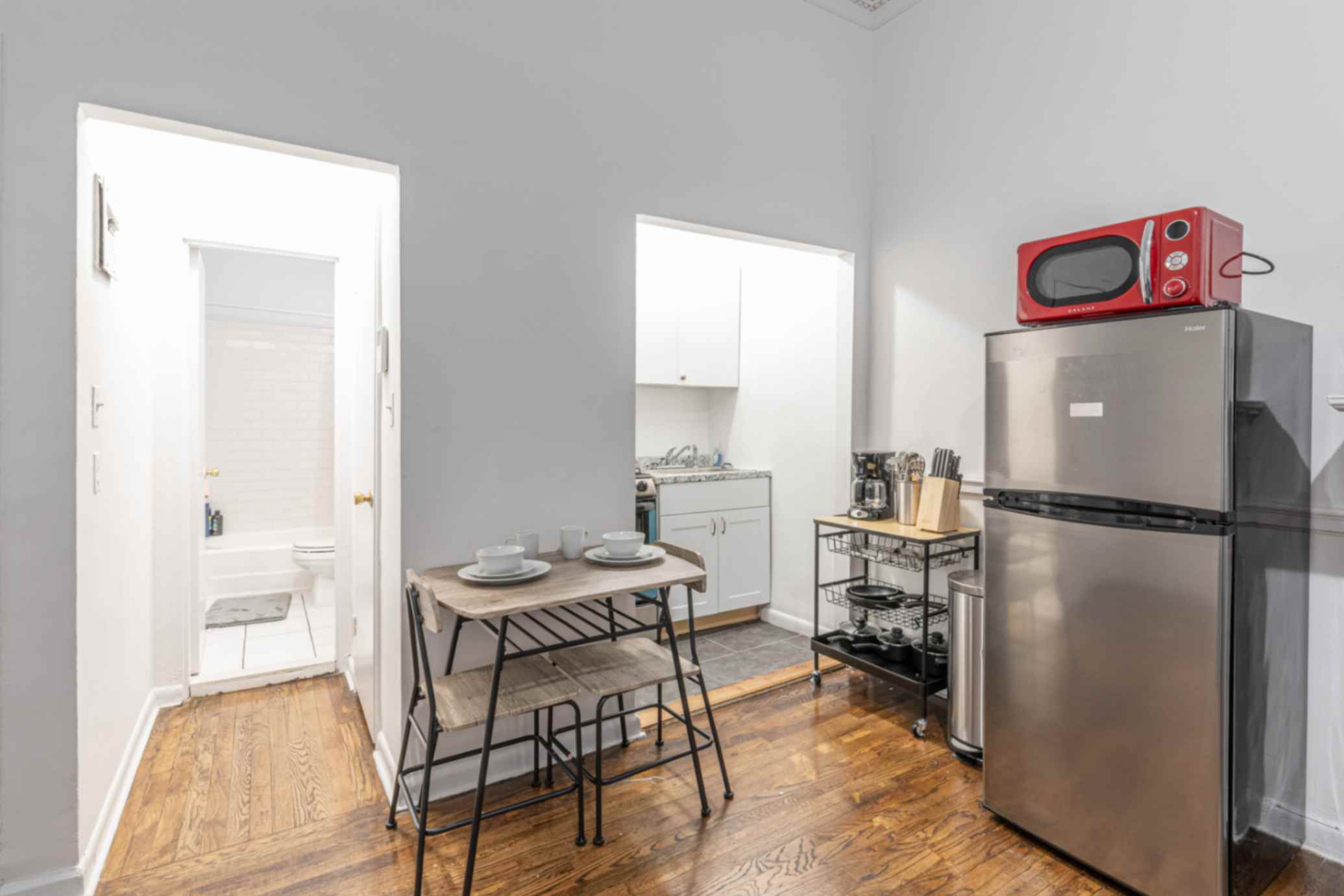 The studio includes a cozy queen bed, ensuring a restful night's sleep. The practical layout of the space creates a peaceful retreat within the bustling city.
