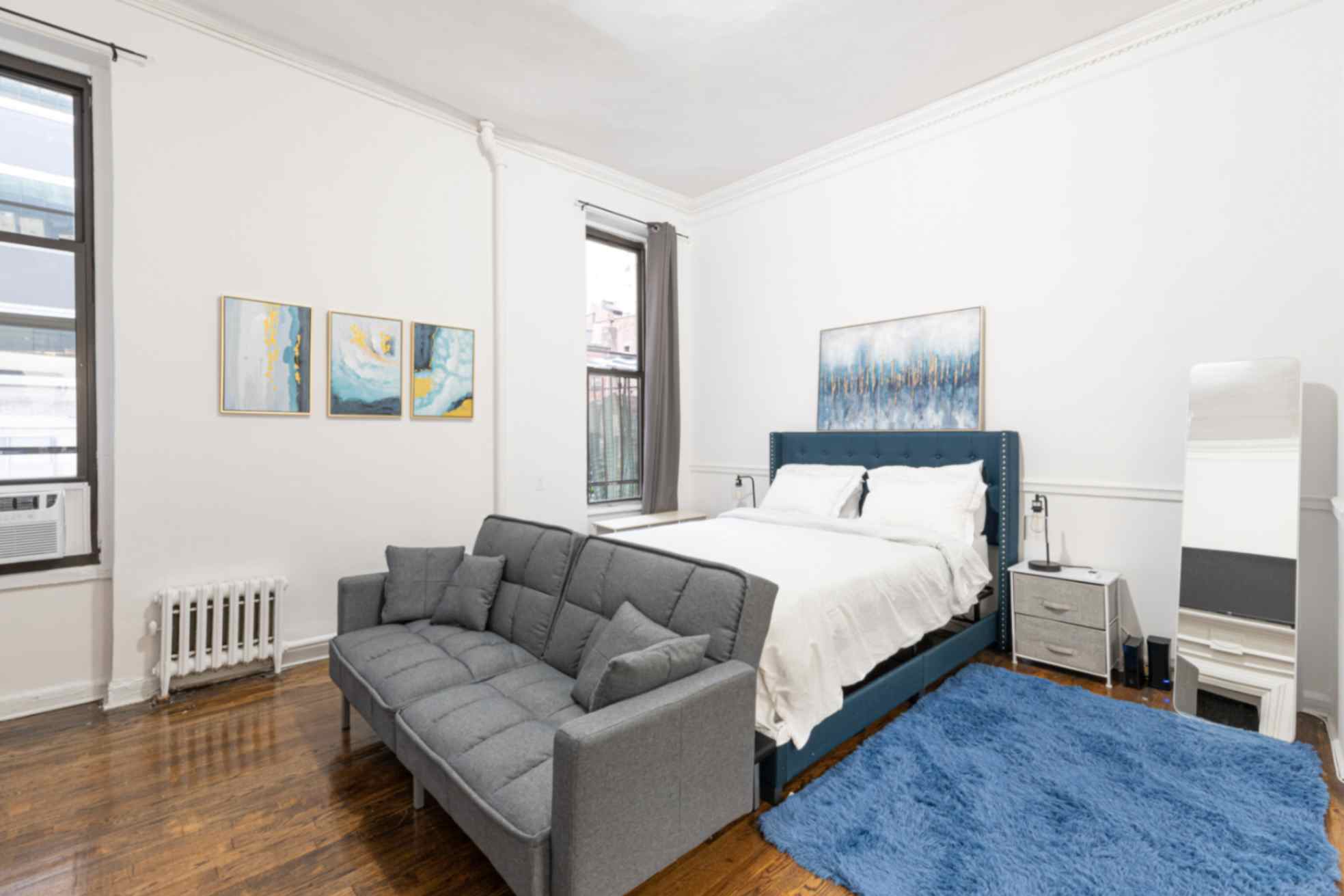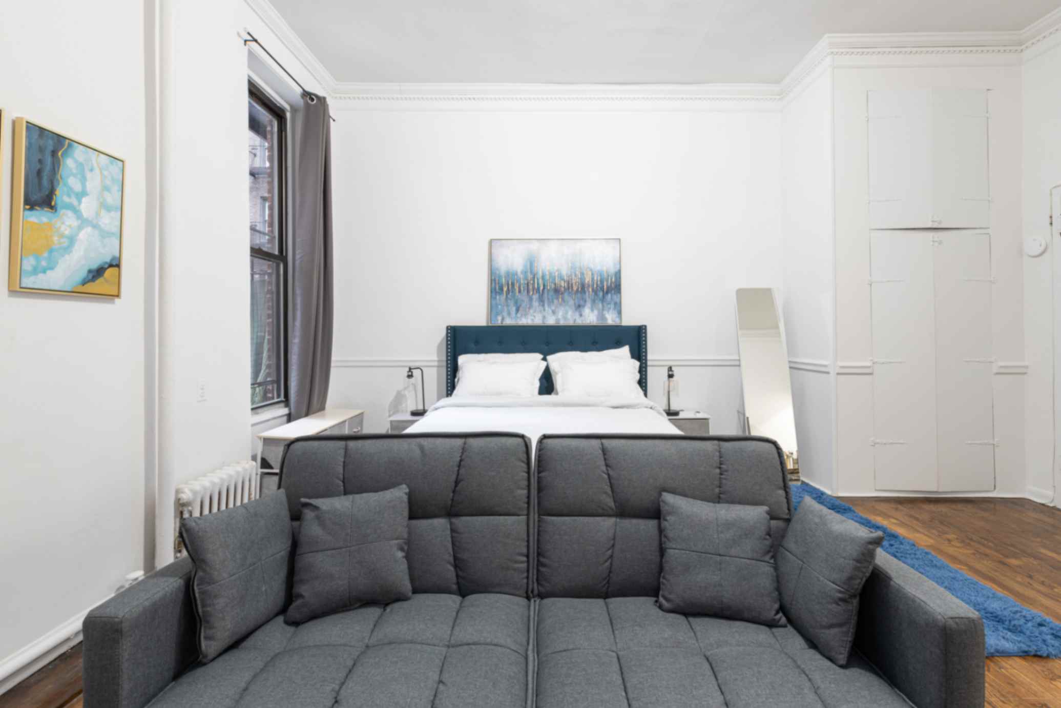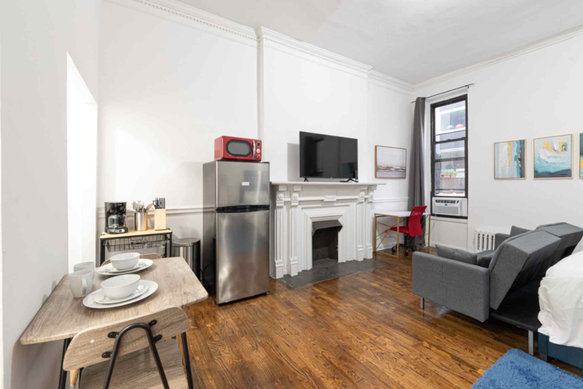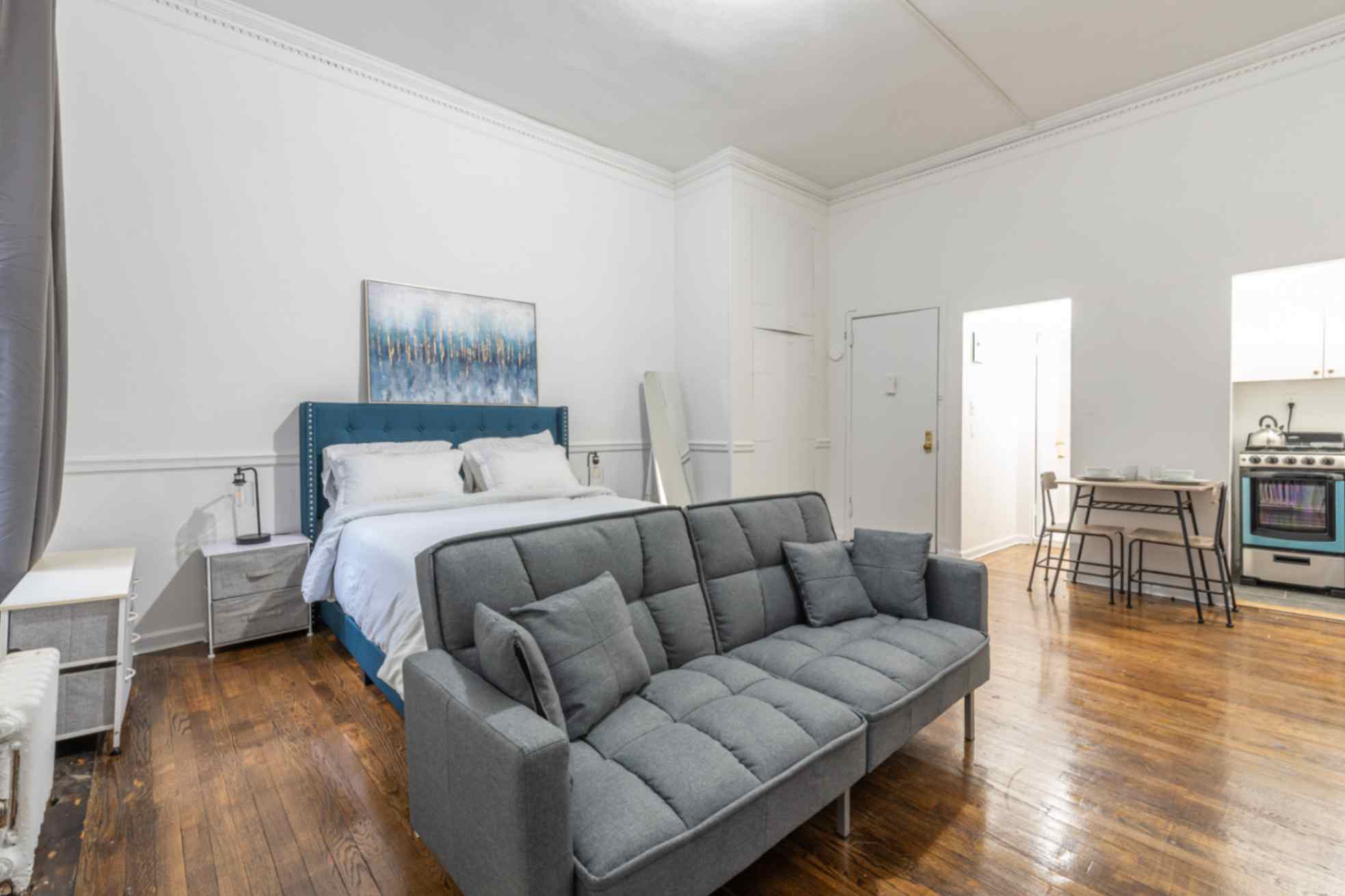 Stylish studio in Midtown East, NYC, near Grand Central Terminal and Rockefeller Center. Features a queen bed, sofa bed, functional desk, and dining space. Book now for a convenient and comfortable stay in the heart of New York City!