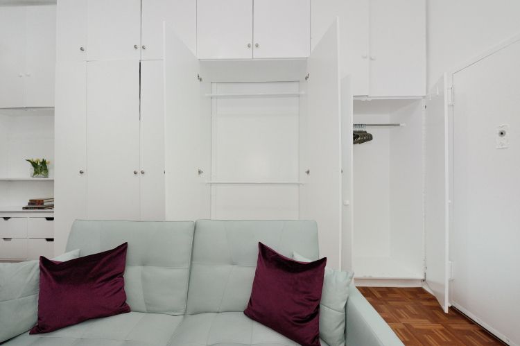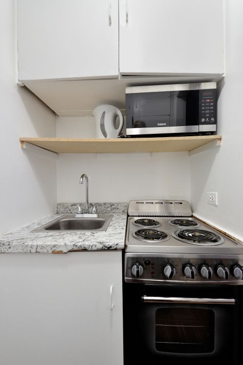 KITCHENETTE & STORAGE The well-equipped kitchenette allows for light meal preparation, and the spacious closet provides ample storage for your belongings, keeping the studio neat and organized.