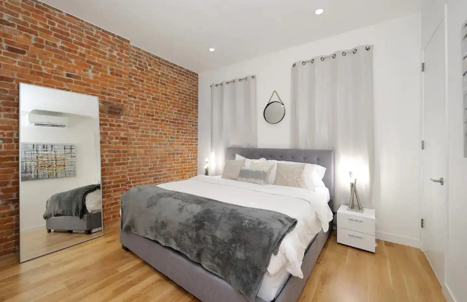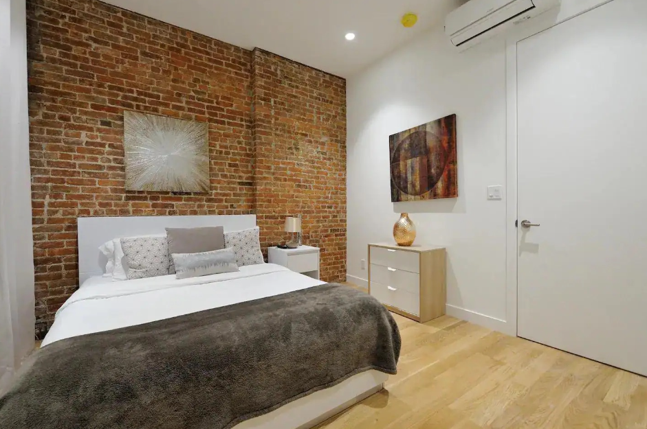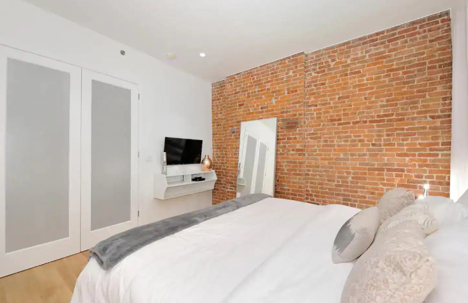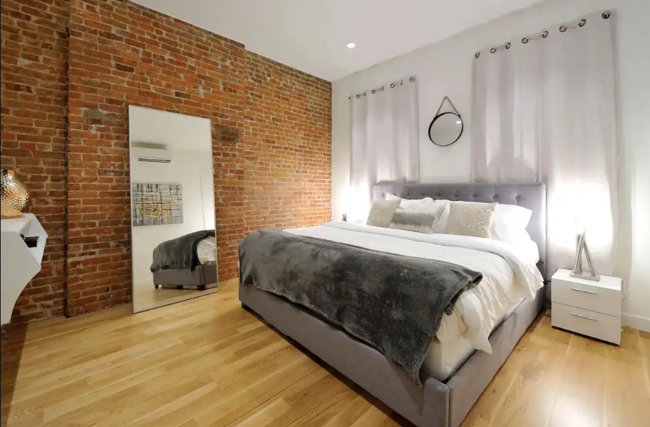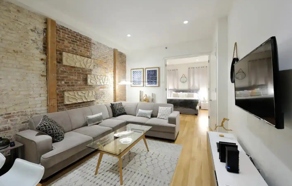 ⭐️ Living Room: Elegant space with exposed brick walls, blending chic, rustic, and modern elegance.